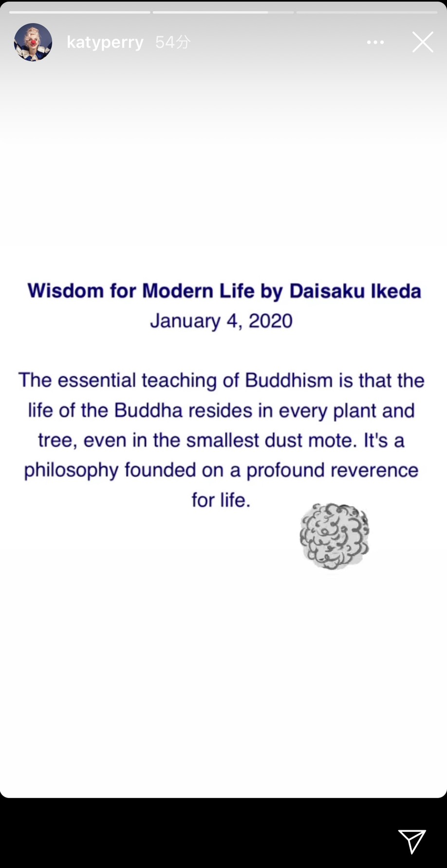 ケイティがシェアしたのは、創価学会の名誉会長である池田大作氏の言葉。ケイティが米現地時間1月4日にインスタグラムでシェアした池田大作氏の言葉と、フロントロウ編集部によるその日本語訳は以下の通り。