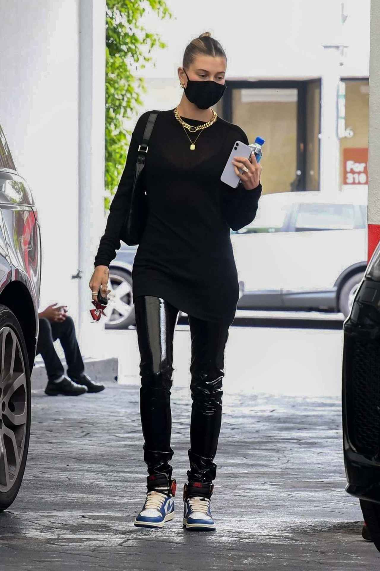 人気モデルのヘイリー・ビーバーは、Steeleのラテックスパンツをメインにしたブラックコーデの足元に「ユニオン × ナイキ エアジョーダン1 レトロ ハイ」のブルーを愛用。ゴールドのチャンキーなアクセサリーでストリート感をプラスして。