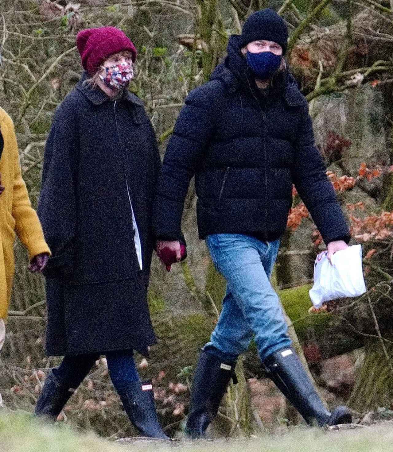 2人が姿を現したのは、ロンドン北部にある公共公園。テイラーは、最新アルバム『エヴァーモア(Evermore)』のビジュアルでも着用していたStella McCartney(ステラ・マッカートニー)のウールコートにインディゴブルーのスキニーデニム、Free Peopleのワインレッドのニットビーニー、ビーニーの色と柄の色がリンクした花柄のマスクを着用。