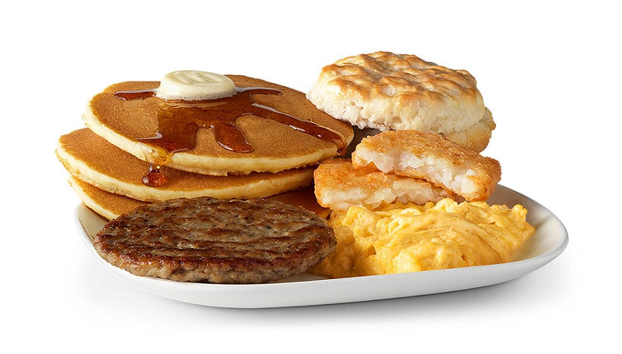 日本のマクドナルドの「ビッグブレックファスト デラックス(ハッシュポテトを含む)」に該当するメニューで、総カロリーは脅威の1,340キロカロリー(※日本版はビスケットではなくイングリッシュマフィンなので979キロカロリー)。