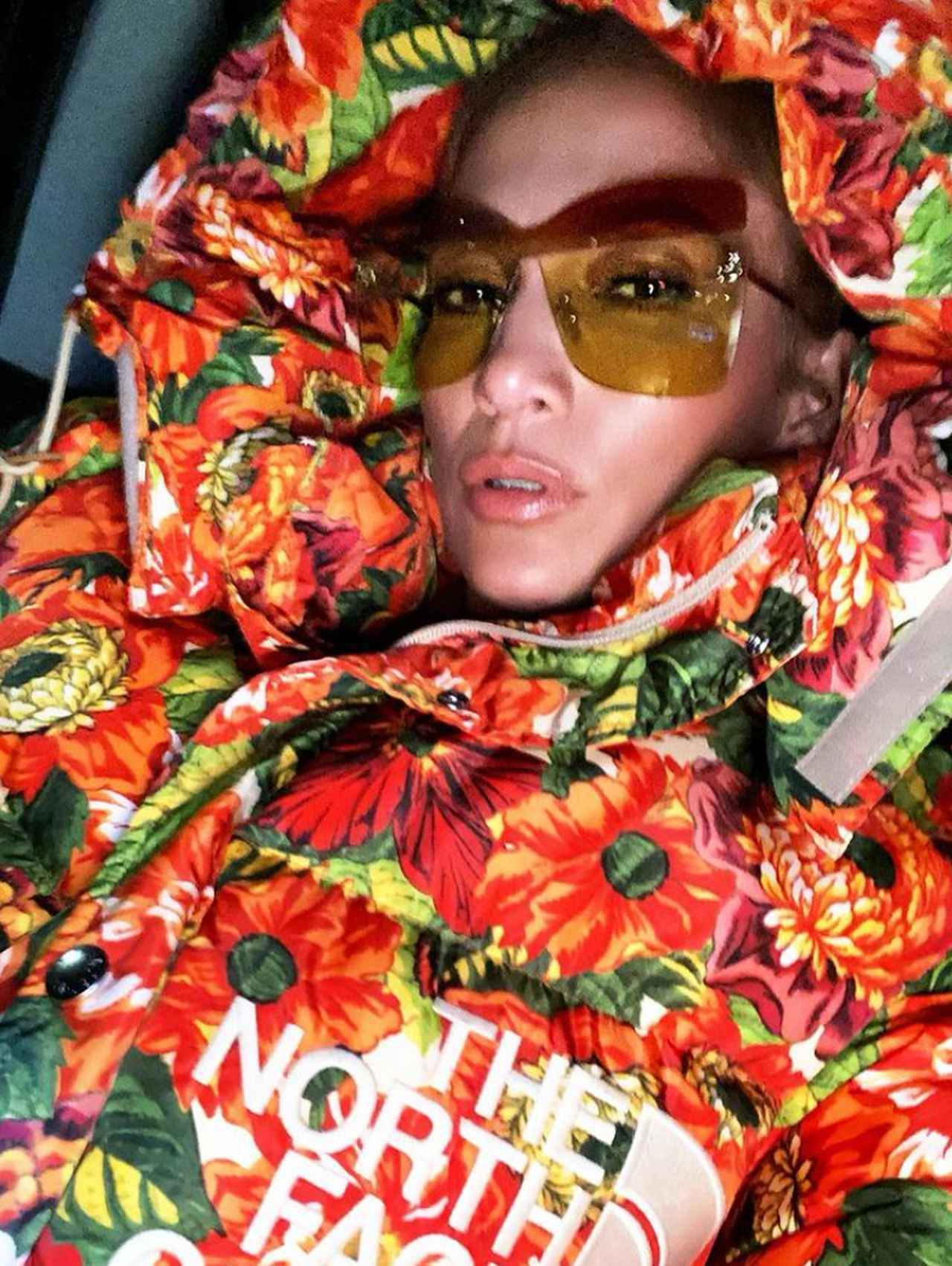 トップセレブのジェニファー・ロペスは、グッチとザ・ノース・フェイスのコラボダウンを着用。今回のコラボのために新たにデザインされたフローラルプリントは、ゴージャスなジェニファーの雰囲気にぴったり。ジェニファーの代名詞でもあるカラーサングラスでグラマラスな着こなしを披露。