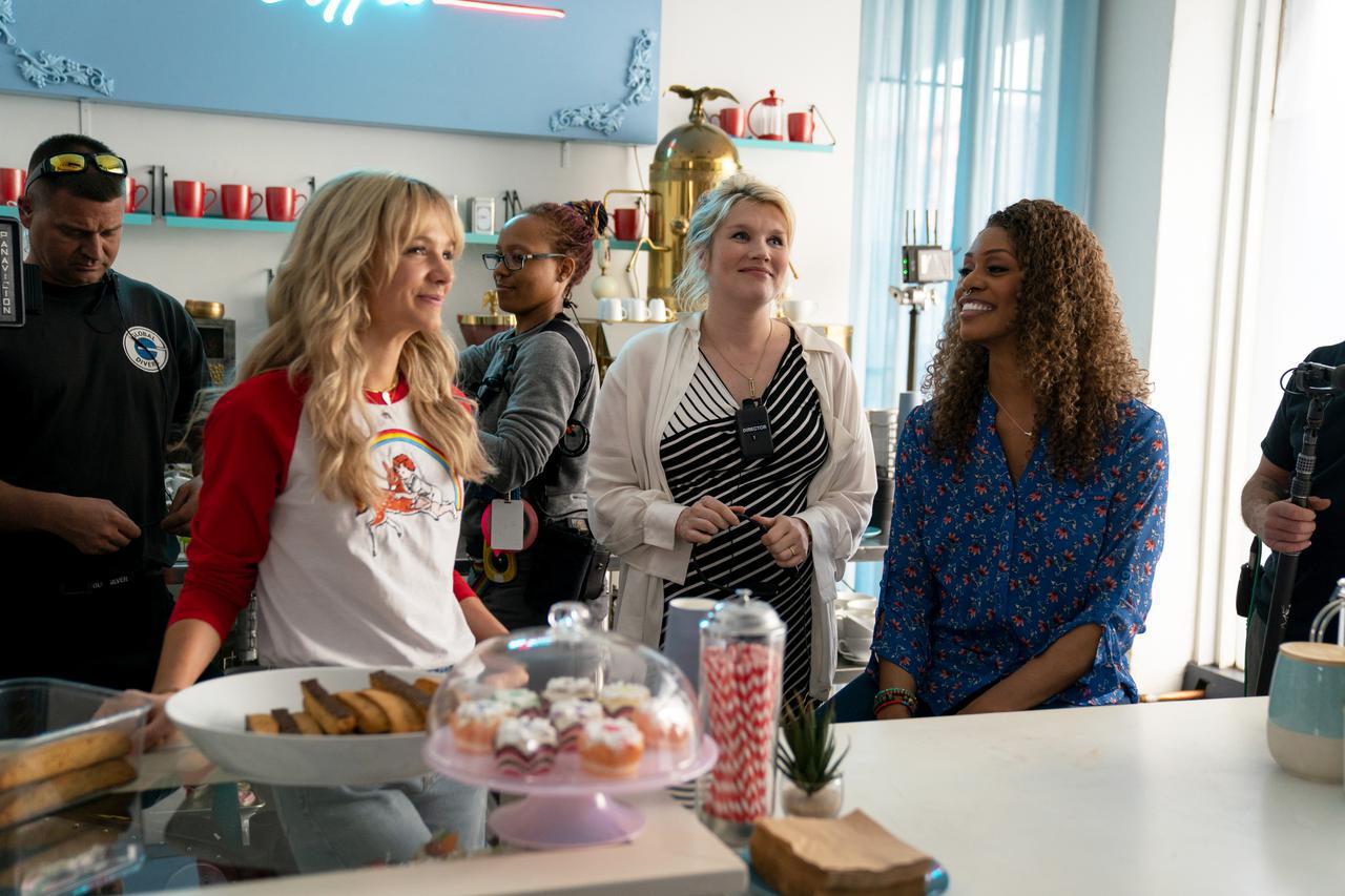 『Promising Young Woman』の撮影現場で。Tシャツを着ているのがキャリー・マリガン。白いシャツを着ているのがエメラルド・フェネル。