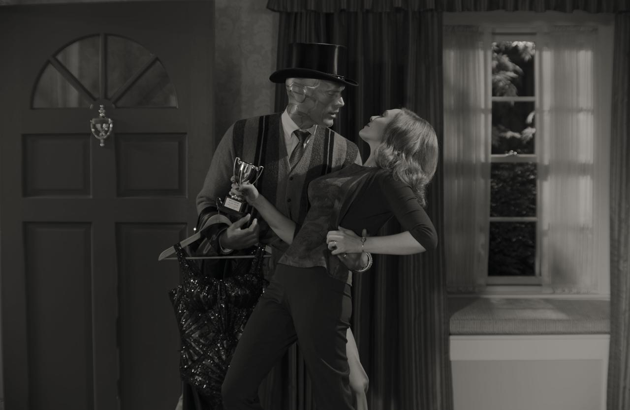 こうして、ようやく始まった食事会。しかしミスター・ハートから、「どこから来たのか?いつ結婚したのか?」といった質問が出ると、一気に部屋の空気がピリつく。シンプルな質問に答えられないワンダとヴィジョン。すると突然、ミスター・ハートが喉に食べ物を詰まらせてしまう。ヴィジョンが能力を使い、なんとか一命を取り留めたミスター・ハート。直後にハート夫妻は、何事もなかったかのような様子で急に帰路につく。そして最後に、別の場所でこの様子をテレビの画面越しに見ている人物の姿が映る…。このエピソードのデザインやドタバタな展開は、1950年代〜1960年代のシットコムである『アイ・ラブ・ルーシー』と『ディック・ヴァン・ダイク・ショー』にインスパイアされている。