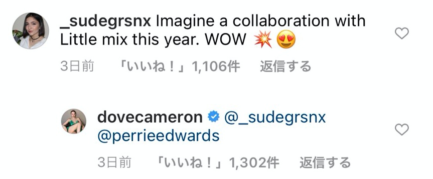 ダヴはインスタグラムの投稿に寄せられるファンからのコメントにたびたびリプライを返しているのだけれど、その中に気になるコメントが。1人のファンが「今年、リトル・ミックスとコラボすることを想像してみてよ」とコメントを寄せると、なんとこのコメントにダヴが反応。リトル・ミックスのメンバーであるペリー・エドワーズのアカウントをタグ付けして、このコメントに返信した。