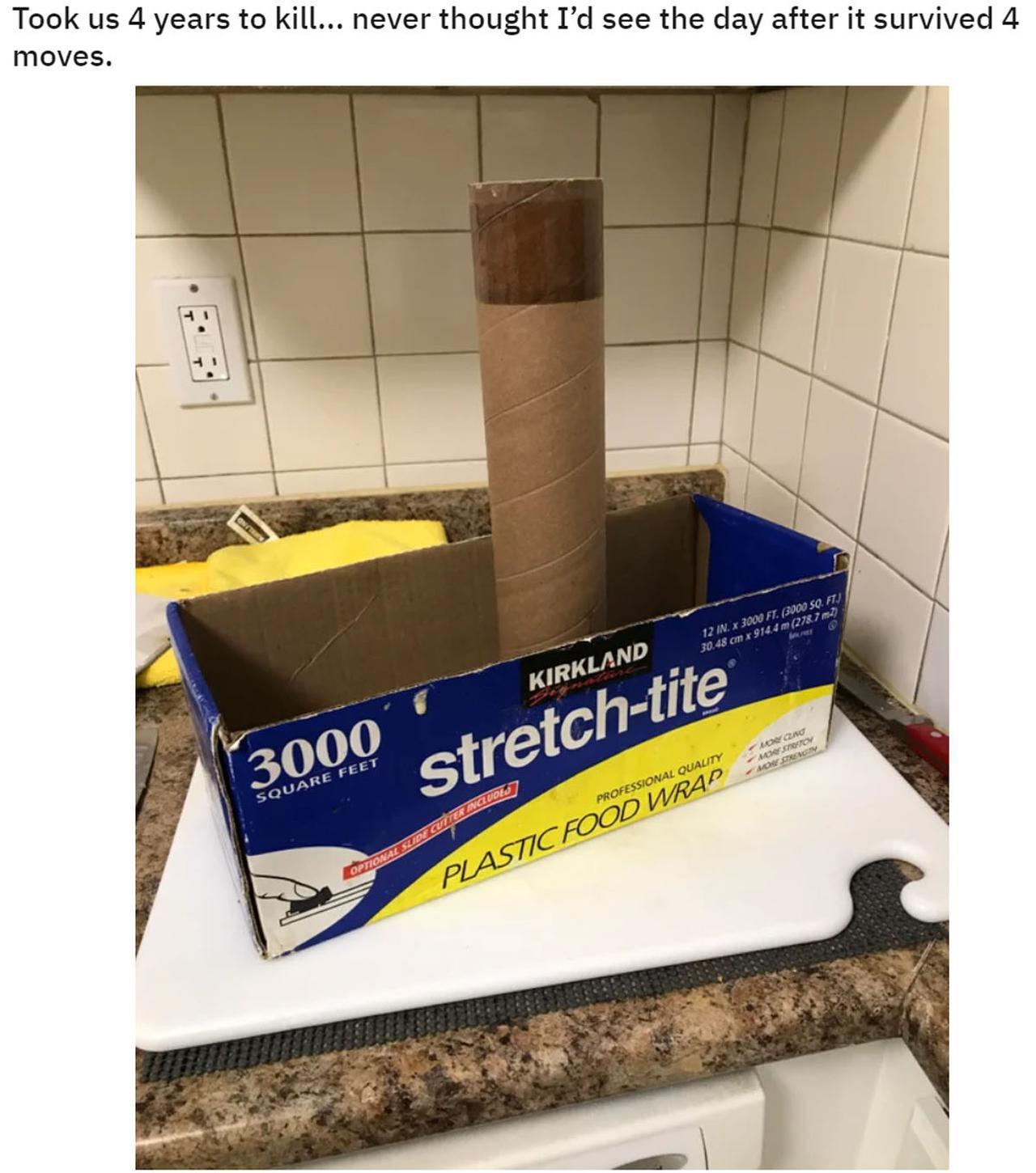 むしろ4年で使い切れたのがすごいような気もするけれど、購入した時にはいつ使い切れるかまったく予想がつかなかったものを使いきれた気分は最高だろう。また、使い終わったからこそ分かる、芯の太さにも驚き。他には、コストコで304.8mのアルミホイルを購入したという別の人物も、使い終わるまでに数年かかり、家を変えるたびに、一緒に引っ越していたとコメントしている。