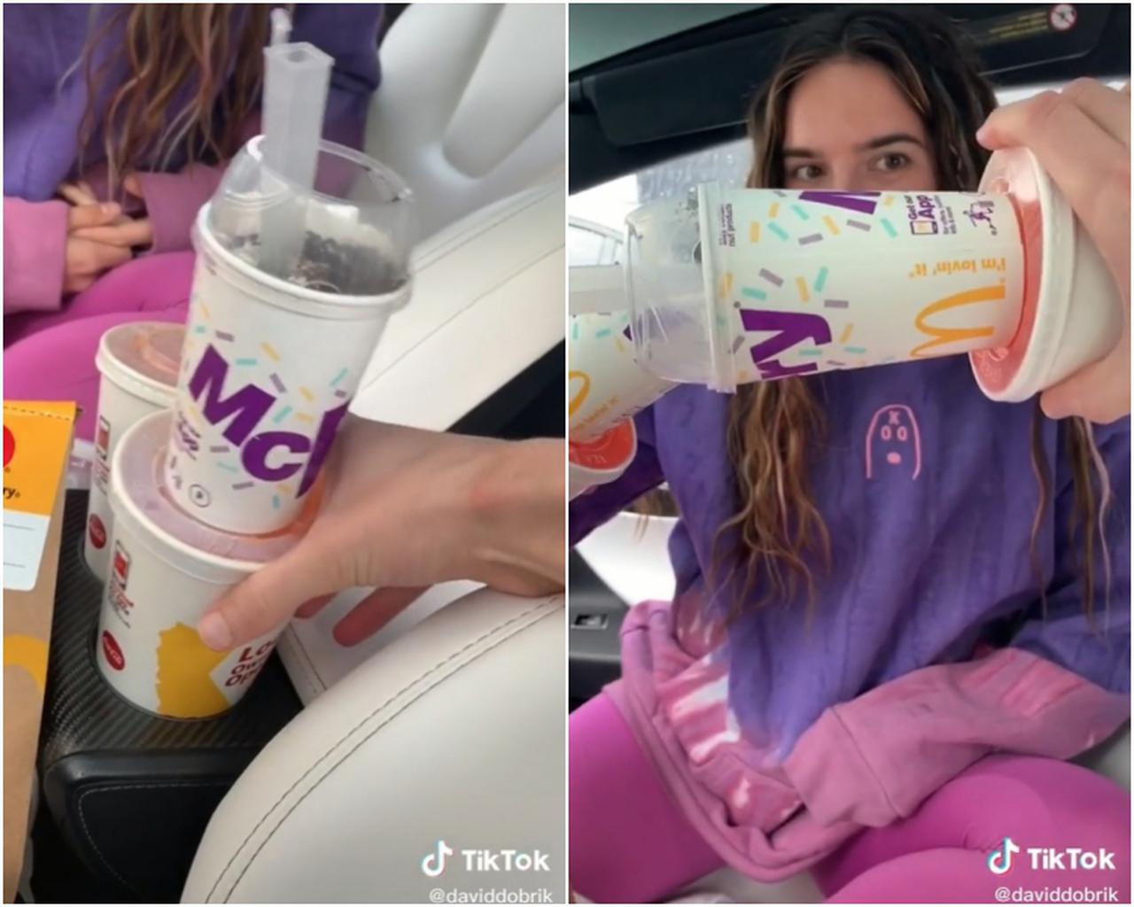別のTikTokユーザーがやっているのを見て、「事実かどうか、自分でも試してみようと思う」とデビッドがチャレンジしたのは、ラージサイズのソフトドリンクのフタに人気スイーツのマックフルーリーのカップを重ねると、ピッタリとハマり、固定されるという裏ワザ。
