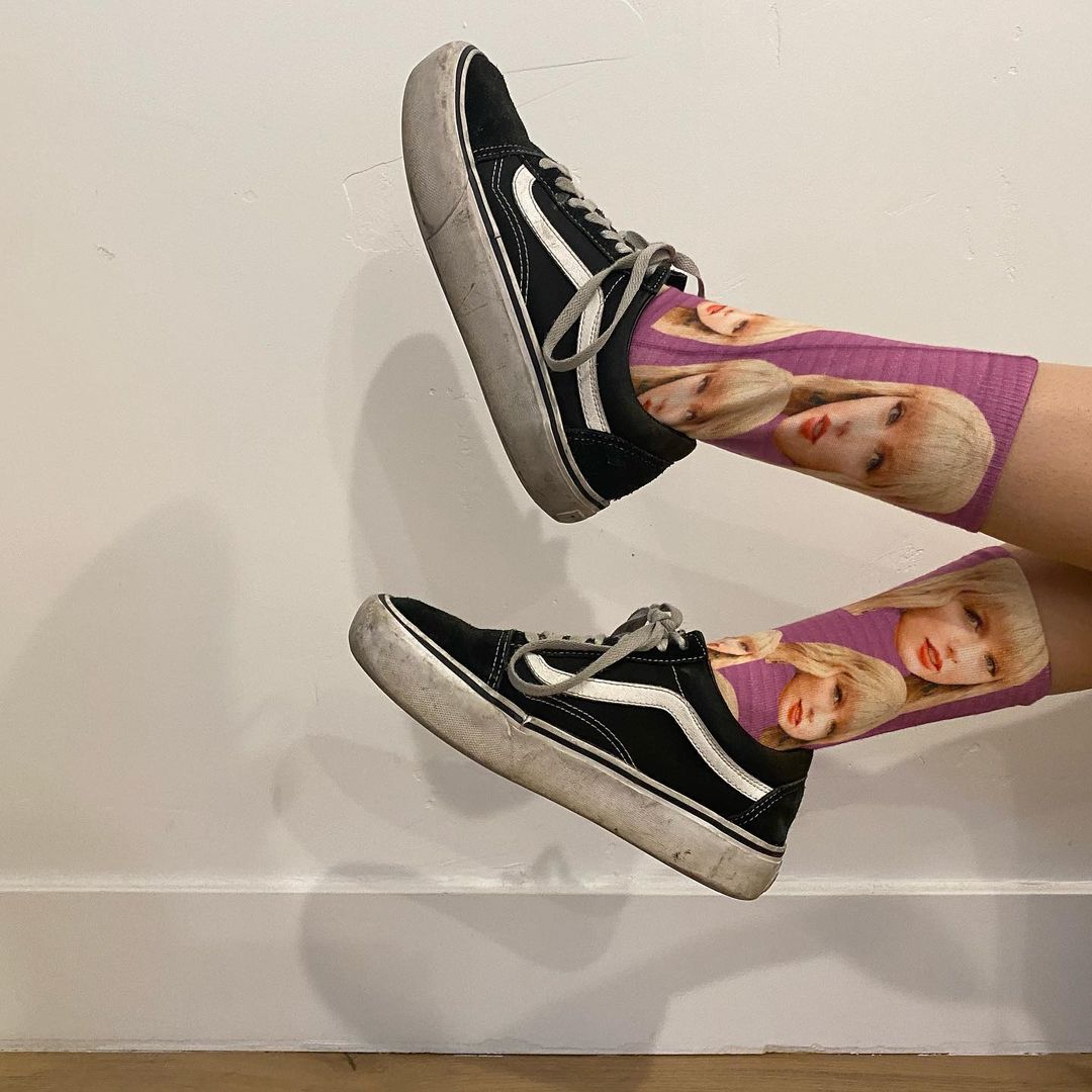 オリヴィアが投稿したのは、テイラーの顔がいくつもプリントされた大胆なデザインの靴下を履いている写真。