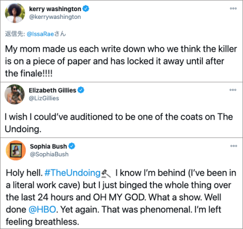 米HBO®︎で2020年10月から6週にわたって放送されたサスペンスドラマ『フレイザー家の秘密』。全6話というミニシリーズは口コミにより毎週視聴者数が上昇し、最終回の視聴者数は第1話より21%も倍増。ファイナルエピソードが全米放送された11月29日には、ドラマの原題である「The Undoing」が米Twitterでトレンド入り。俳優、モデル、リアリティスター、ラッパーなど多くのセレブのアカウントでも『フレイザー家の秘密』についての投稿がみられた。