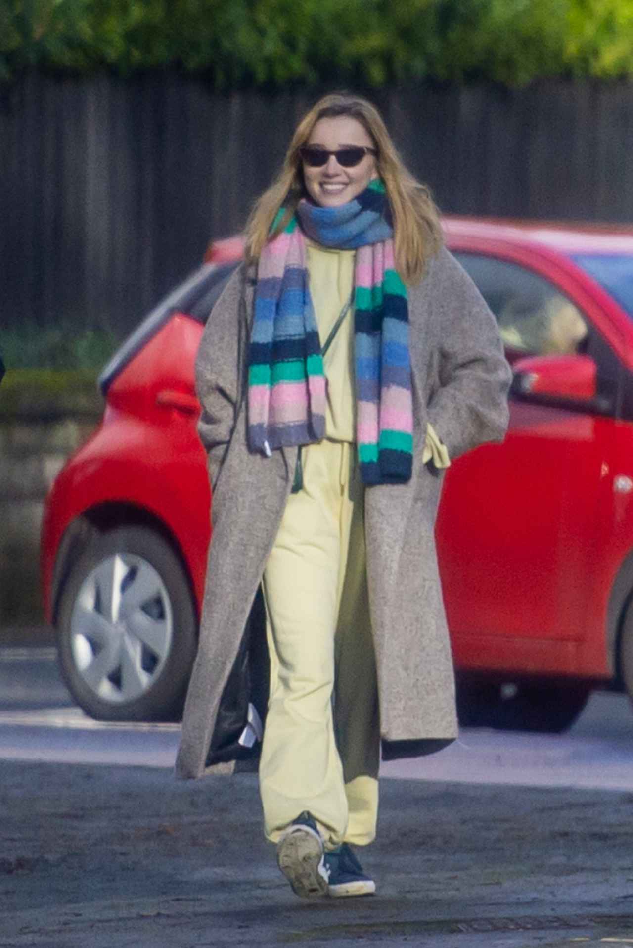 レモンイエローのスウェットの上下にグレージュのウールコートを合わせ、カラフルなストライプのスカーフをくるりと。