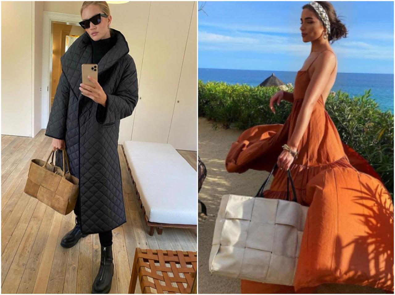人気モデルのロージー・ハンティントン・ホワイトリーは、黒のロングキルティングコートにボッテガ・ヴェネタのキャメルの「ザ・アルコ トート」を合わせ、スタイルに抜け感を作って。