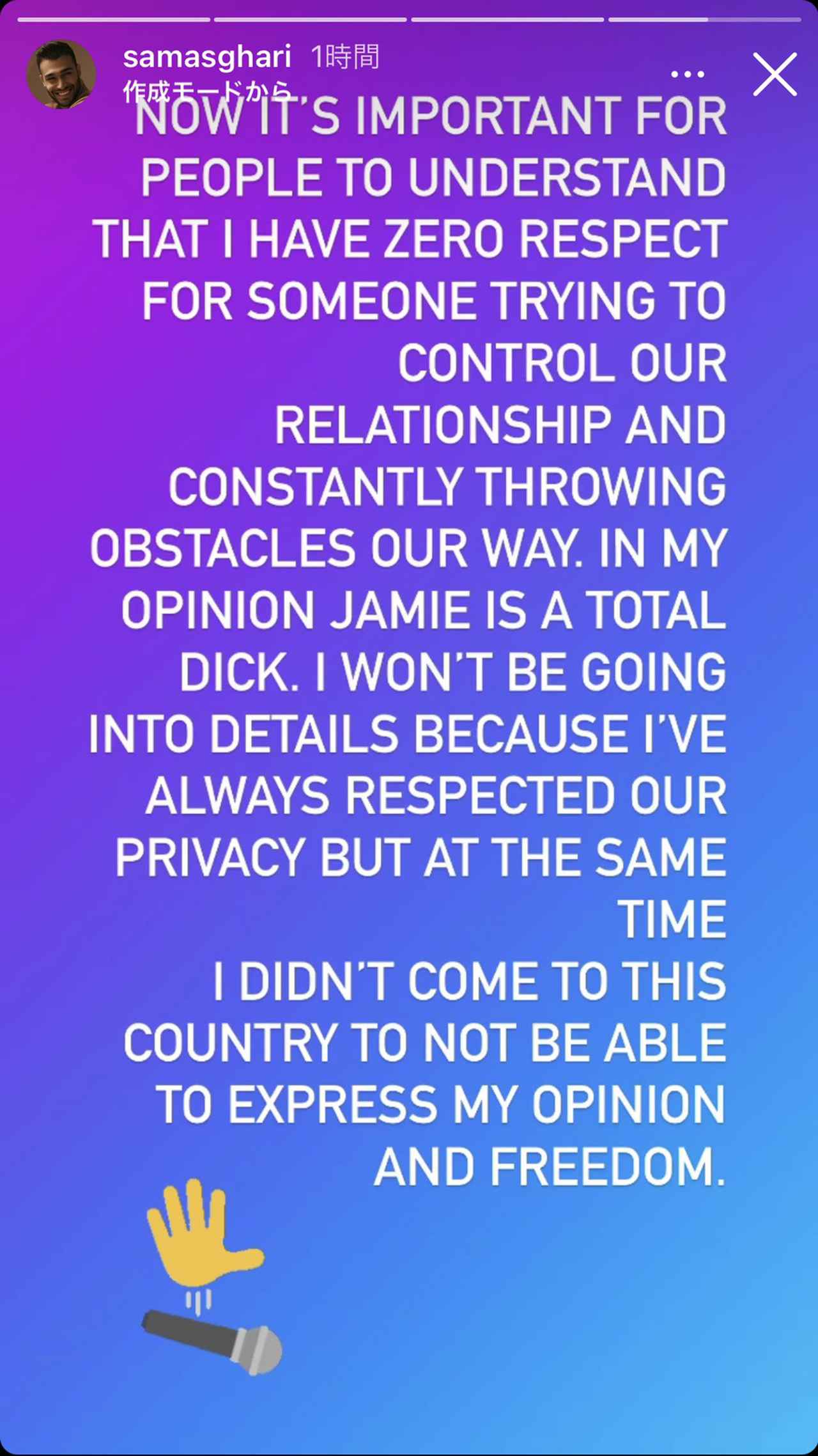 サムはインスタグラムストーリーに「みなさんに理解していただきたい重要なこととして、僕たちの関係をコントロールしようと試み、僕らの道に頻繁に障壁を設けてくるような人に対して僕は尊敬の念を一切抱いていないということです。僕の見解では、ジェイミーは完全なクソ野郎です。自分たちのプライバシーを尊重してきたので詳細を伝えることはしませんが、私がこの国に来たのは、自分の意見や自由を抑え込むためではありません」と、マイクを落とす絵文字を添えて綴り、ジェイミーについて「クソ野郎」という強い言葉を使って批判した。