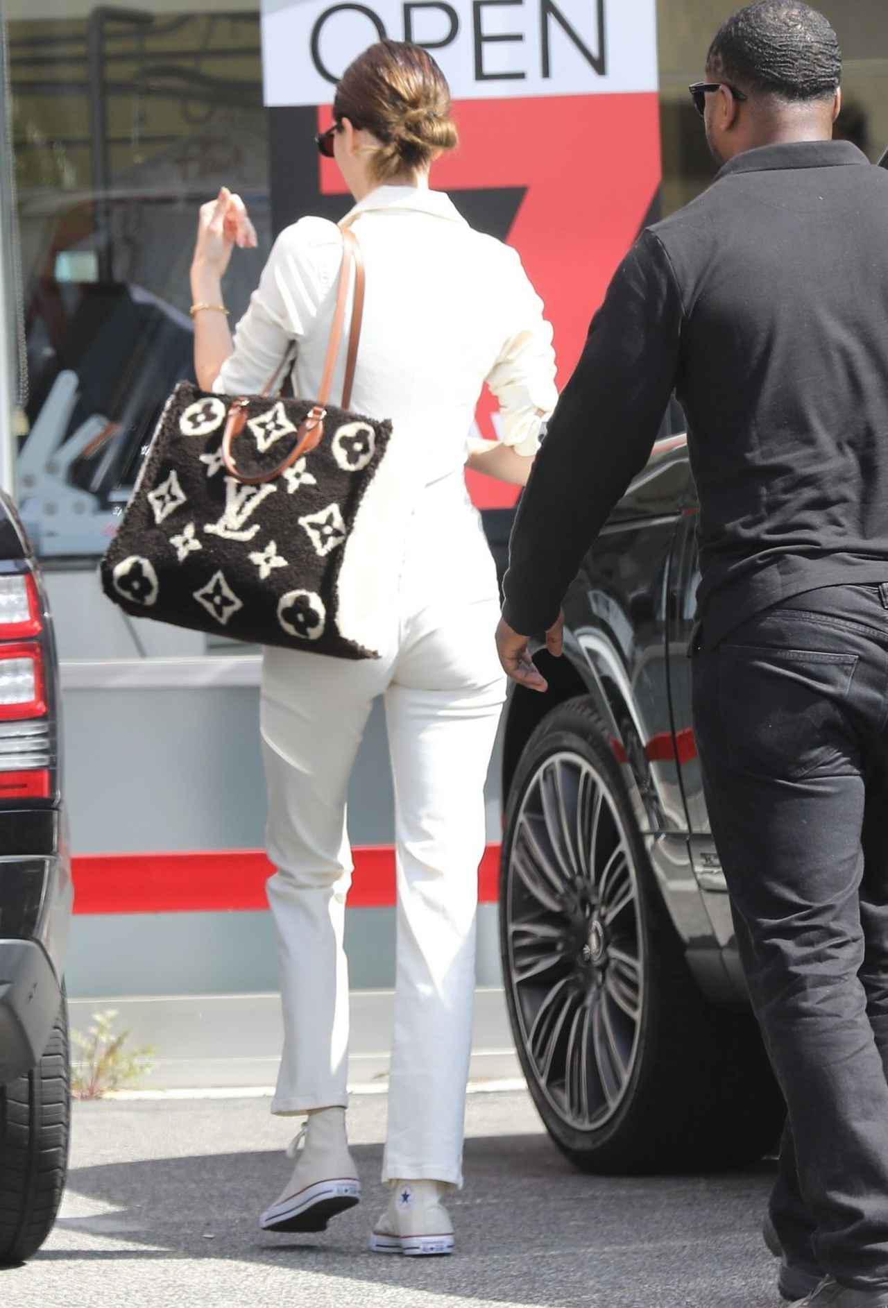 足元にはコンバースの白のチャックテイラーで、全体を白でつなげてIラインを強調。ストレートパンツには、コンバースがすっきり見えて好相性。バッグはLouis Vuitton(ルイ・ヴィトン)のビッグトートでポップなアクセントをつけて。