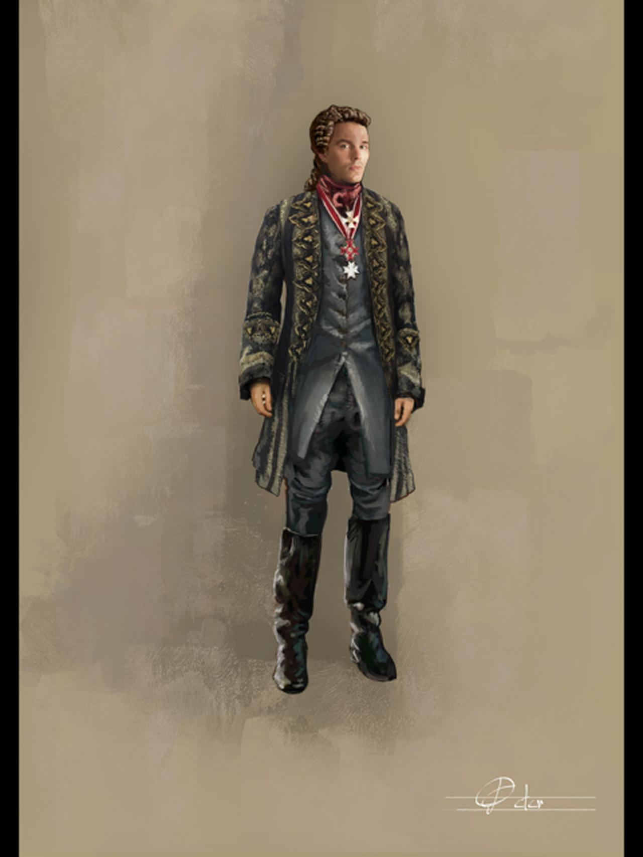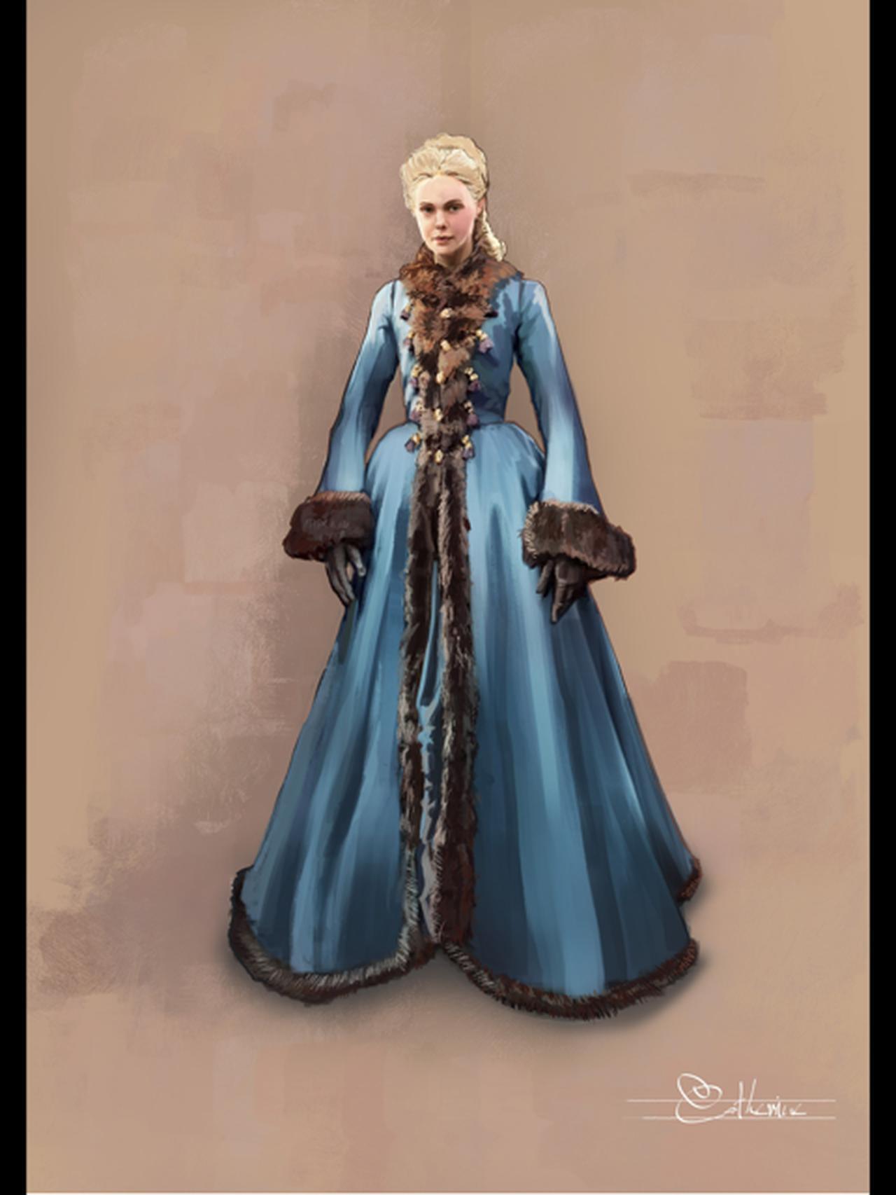 シリーズの最初の方では、エカチェリーナは愛を探している理想主義でロマンチックな若い女の子です。最初はそのような彼女の特徴を反映した衣装を使用しており、風変りともいえる淡い色のオリジナル柄のダマスク生地を選びました。レフ(セバスチャン・デ・ソウザ)がエカチェリーナの世界に入ってきた時、彼女の衣装はまだ若々しくて遊び心がありましたが、色使いが変わり、レフの衣装に似たものになりました。エピソード 8から、エカチェリーナは宮廷の世界に挑み始め、彼女の衣装は色が強くなり、生地はより大胆になり、衣装ははるかにロシアの雰囲気を持っています。クーデターが始まり、彼女の強さが明らかになると、最終的に彼女の衣装は鮮やかな色合いのものになっています。