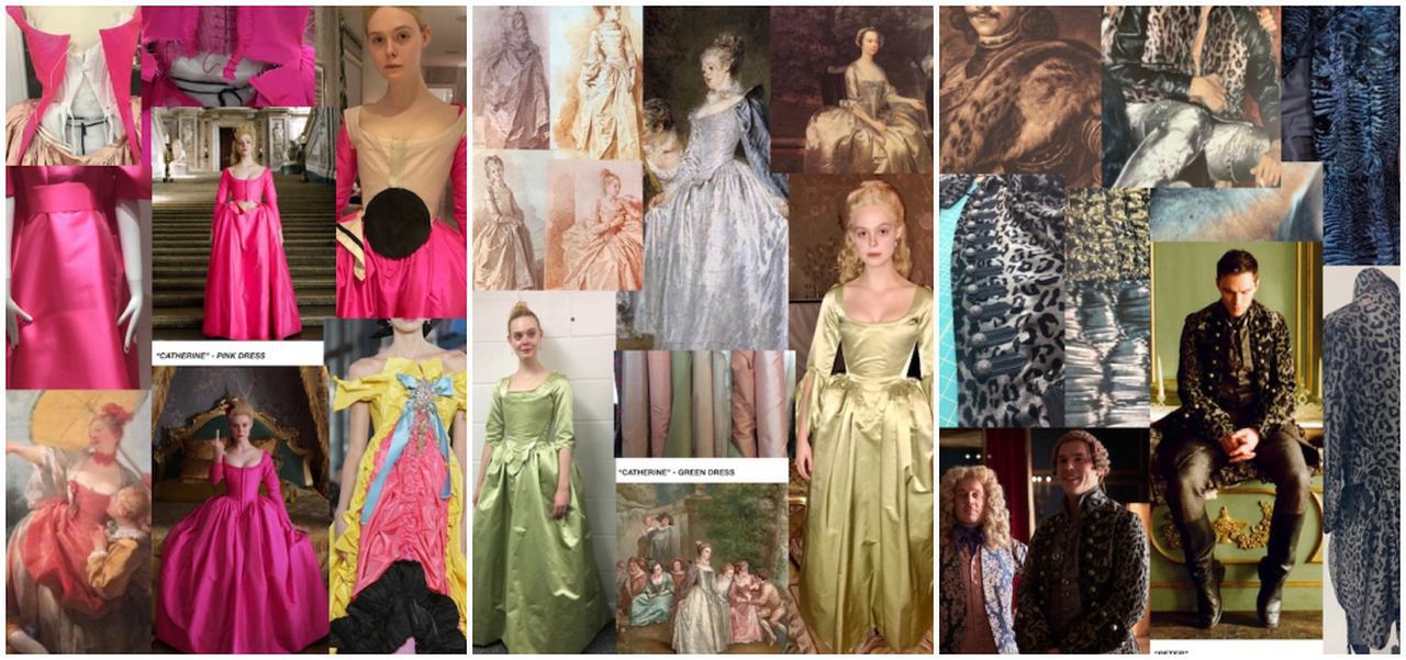 新しいプロジェクトの開始時には、私は常に脚本の世界に浸るようにしています。リサーチから始め、ロンドンの美術館やアートギャラリーを訪れ、ヨーロッパや英国の18世紀の絵画やエカチェーナやピョートルや18世紀のロシアの絵画を参照したりします。本作の衣装をデザインする上で重視していたことは、ハイエンドなファッションの要素とディテールをミックスさせた衣装で18世紀の世界を作り出すことでした。私は、本作の衣装デザインにそれらの要素を組み込むために、現在のハイエンドなファッション、形、生地、装飾を探求しました。18世紀のシルエットにモダンなファッションのディテールとシャープで綺麗なラインを組み合わせてデザインされた衣装を目指したんです。プリプロダクションでは、私とアシスタントは英国とヨーロッパの衣装店を訪れました。私たちは、面白い生地、装飾物、ボタンを探すためにヴィンテージマーケットにも行きました。また、プロジェクト開始時には多くの生地をリサーチし、調達を行いました。