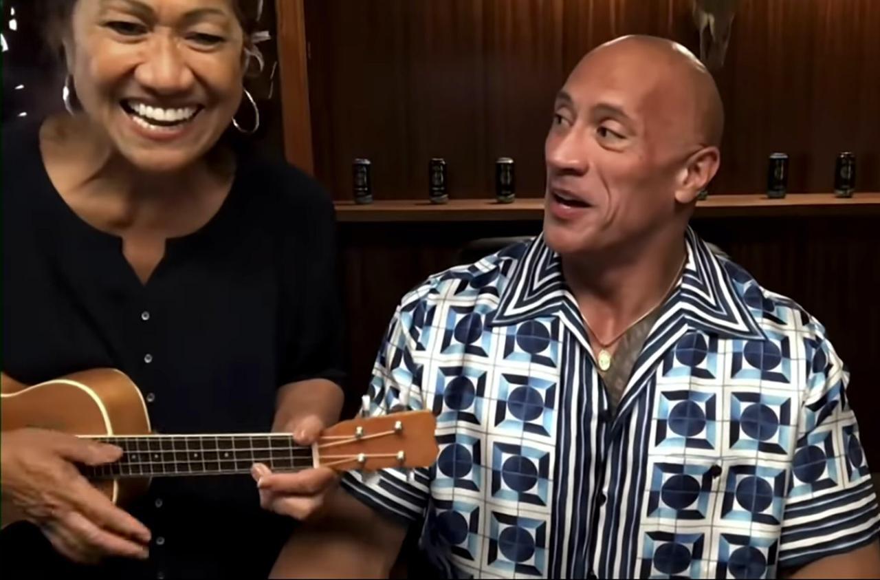 つい最近、ドウェインのインスタグラムで彼の母親がウクレレを演奏する姿を見たというジミーが、その腕前に驚いたことを明かすと、ドウェインはその時ちょうどそばにいた母に向かって「ウクレレを持ってきて」とお願い。そして、そのまま母をカメラの前に招き入れると、軽く演奏することを提案した。