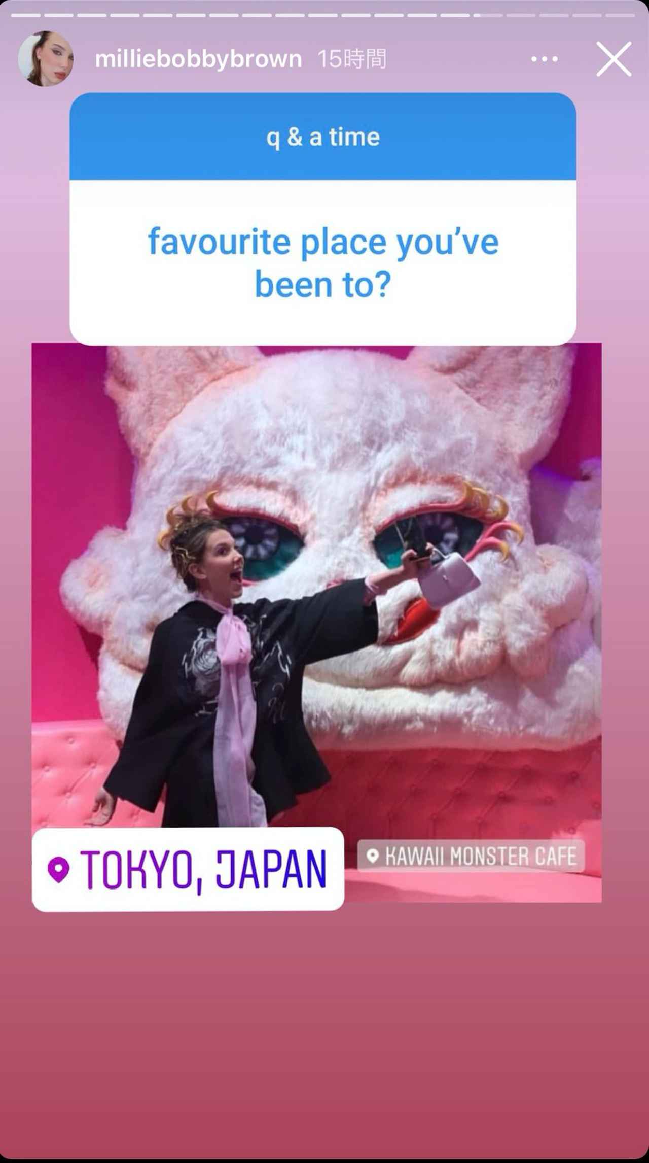 ミリーは2019年、『ストレンジャー・シングス』シーズン3のプロモーションのために来日した際、2021年1月末をもって惜しまれながら閉店した東京・原宿のkawaii monster Cafeでファンミーティングを行なったのだけれど、海外セレブにもファンが多いことで知られるこのカフェがかなり気に入ったようで、kawaii monster Cafeの位置情報をつけて、おそらくその時に撮影したと思われる写真を投稿した。