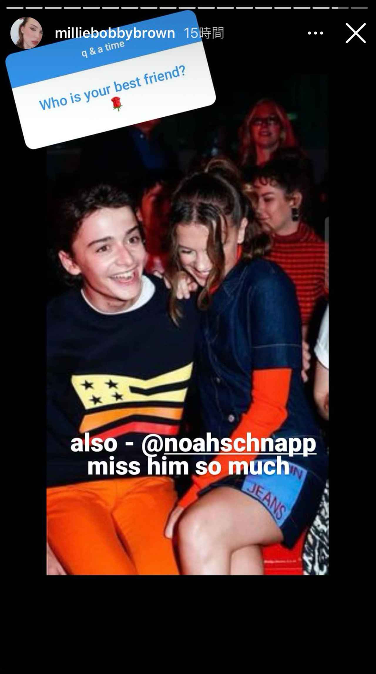 ファンとのQ&Aのなかで、ミリーは“仲の良い男友達は誰か”という質問にも回答しており、『エノーラ・ホームズの事件簿』で共演したルイス・パートリッジや、『ストレンジャー・シングス』で共演しているノア・シュナップらの名前を挙げた。ちなみに、先日、『ストレンジャー・シングス』の撮影現場でその姿が目撃されていたミリーだけれど、どうやら同作でウィルを演じているノアとはまだ合流できていないようで、ノアとの写真を投稿した際に、「彼がすごく恋しい」とコメントを添えている。
