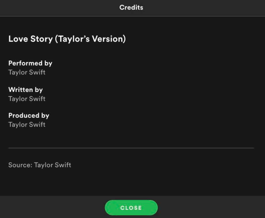 Spotifyの「ラヴ・ストーリー(テイラーズ・バージョン)」のクレジット。©Spotify