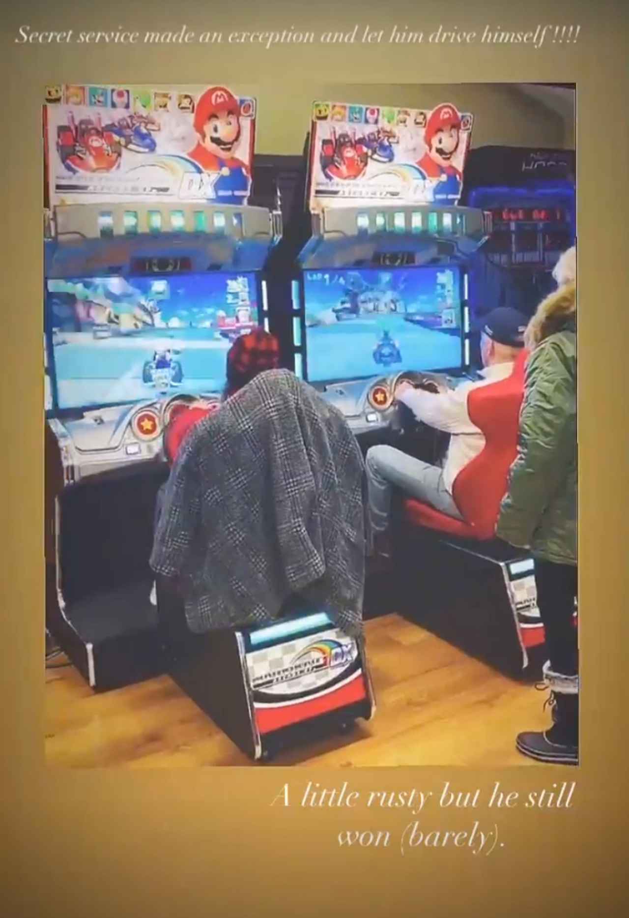ジーンズにベースボールキャップというラフな出で立ちで、2台並んだ『マリオカート アーケードグランプリDX』のハンドルを握り、孫娘の1人と対戦したバイデン大統領。