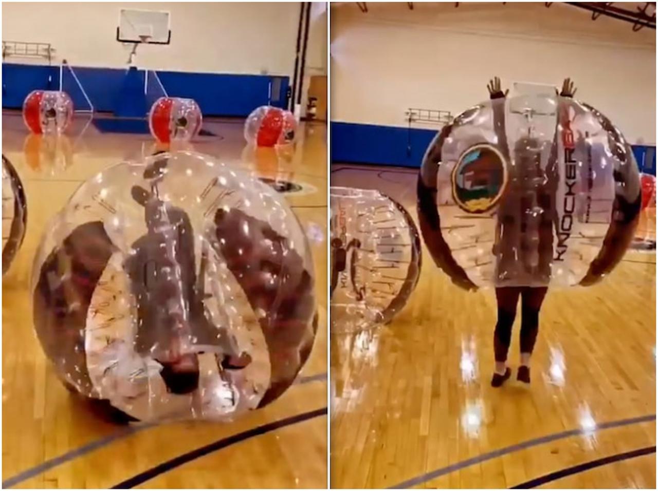 室内運動場では、日本の複合エンターテインメント空間「ラウンドワン」の一部の店舗でも楽しめる、“バブルサッカー”ができる設備もそろっているようで、ナオミはバブルに入って転がってみせるブーメラン動画も公開していた。