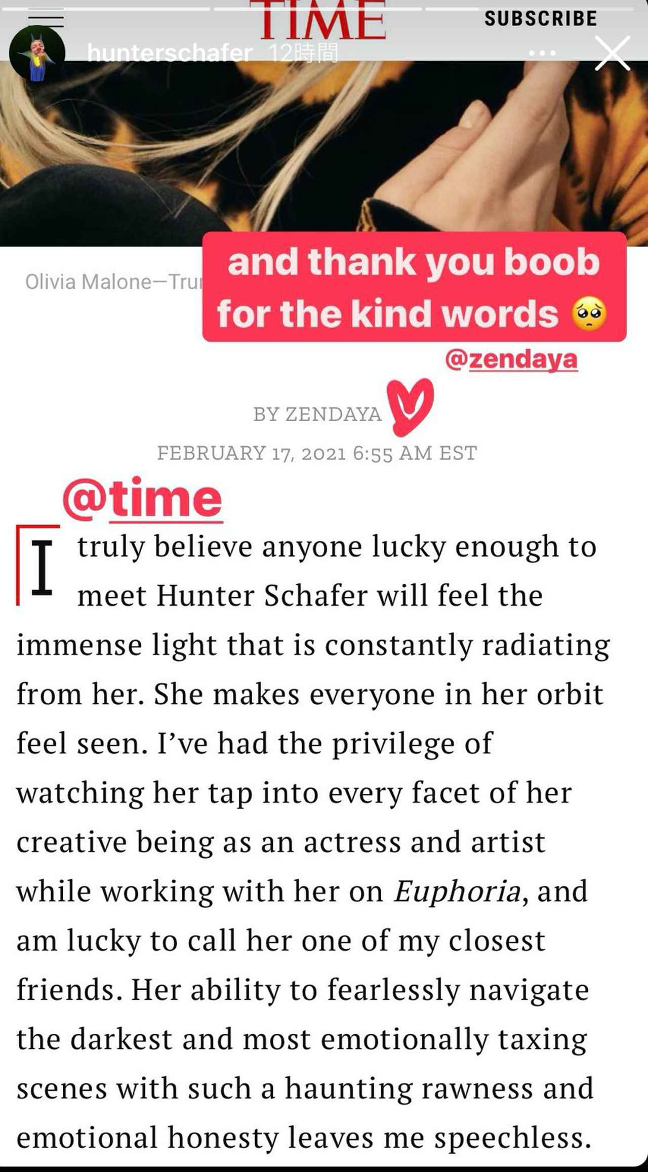 ハンターはインスタグラムストーリーでゼンデイヤからの推薦文にリアクションしており、推薦文のスクリーンショットを投稿したハンターは、ゼンデイヤの名前の横にハートを添えて、「優しい言葉をありがとう」と感謝を綴った。