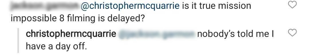 しかし、そのウワサにクリストファー・マッカリー監督が反応した。クリストファー監督はスマホである音楽を聞いているところをインスタグラムで公開。その投稿にファンが「『ミッション:インポッシブル8』の撮影が遅れてるって本当?」と問うと、クリストファー監督はその質問に「誰からも(そんなこと)聞いていない。休みなんだ」と8作目が遅れることは聞いていないということを明かした。