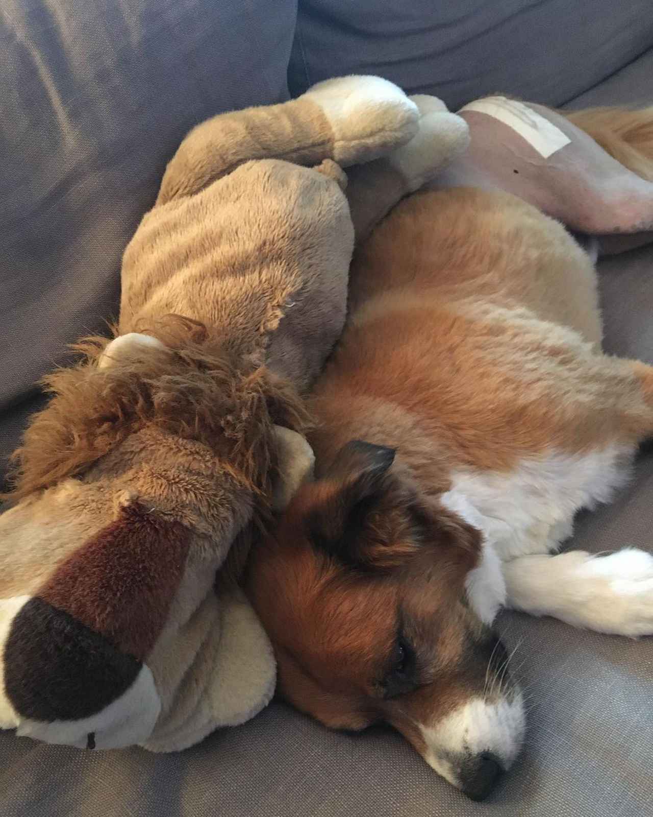 手術から帰ってきたドジャーも、お気に入りのぬいぐるみが恋しかったようで、クリスが直したばかりのぬいぐるみと一緒に寝ている写真も投稿されている。