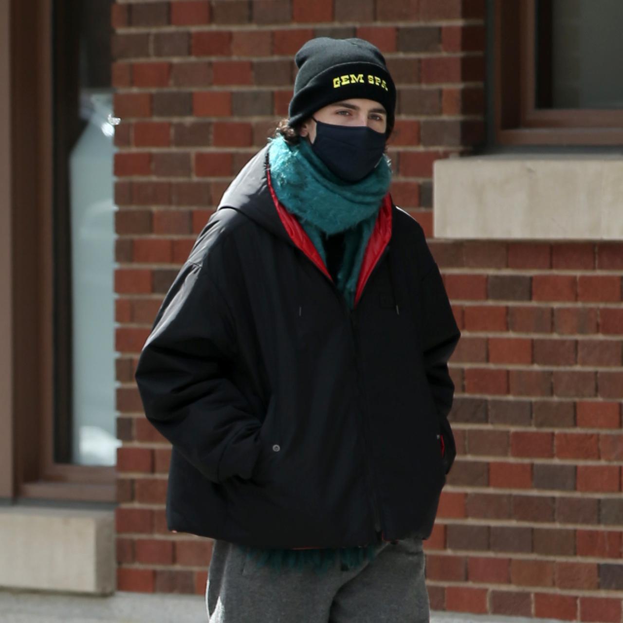 厚手のジャケットにニット帽とマフラーでしっかりと防寒対策をし、ポケットに両手を突っ込んで歩くティモシー。マスクをしていて目元しか見えていなくても、美青年っぷりがうかがえる。