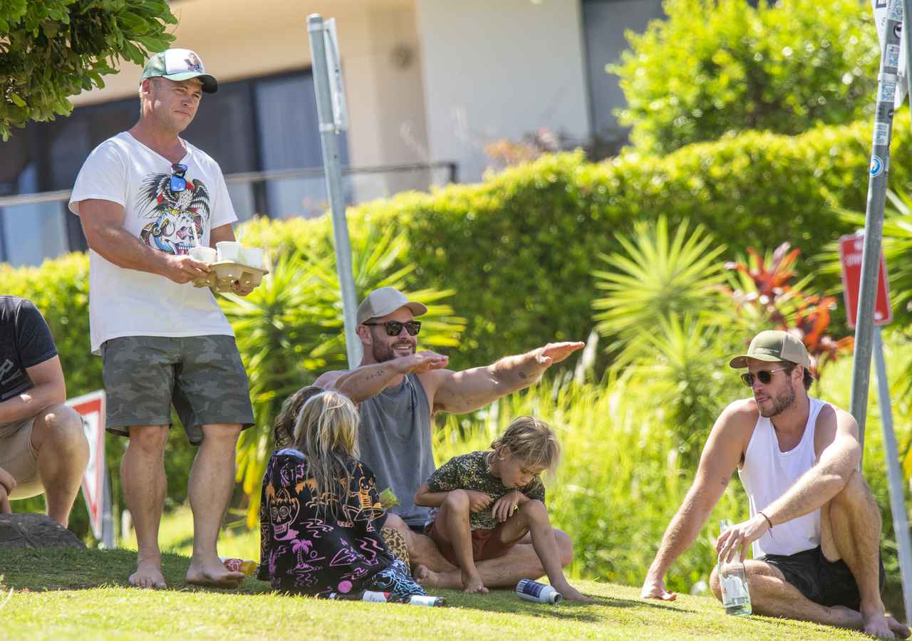 今月上旬に地元バイロンベイにて撮影。共に俳優である兄のルーク(左)と弟のリアム(右)も交えて家族で休日を過ごしたクリス。