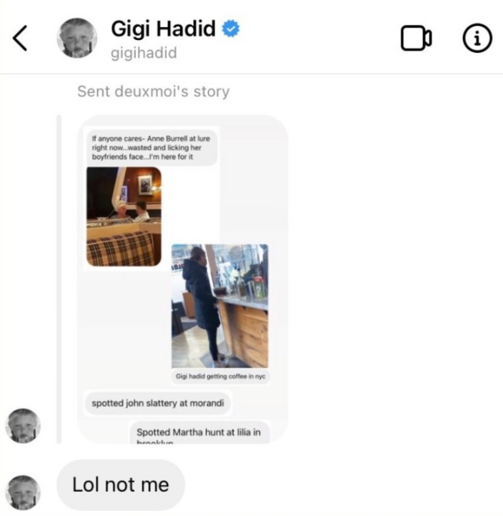 しかし、やはりファンから寄せられた情報のなかにはガセネタがまじっている場合もあるようで、先日、Deux Moiのストーリーに「ニューヨーク市内でコーヒーを買うジジ・ハディッド」というコメントとともにアップされた写真に、ジジ本人からこんなクレームが届いた。