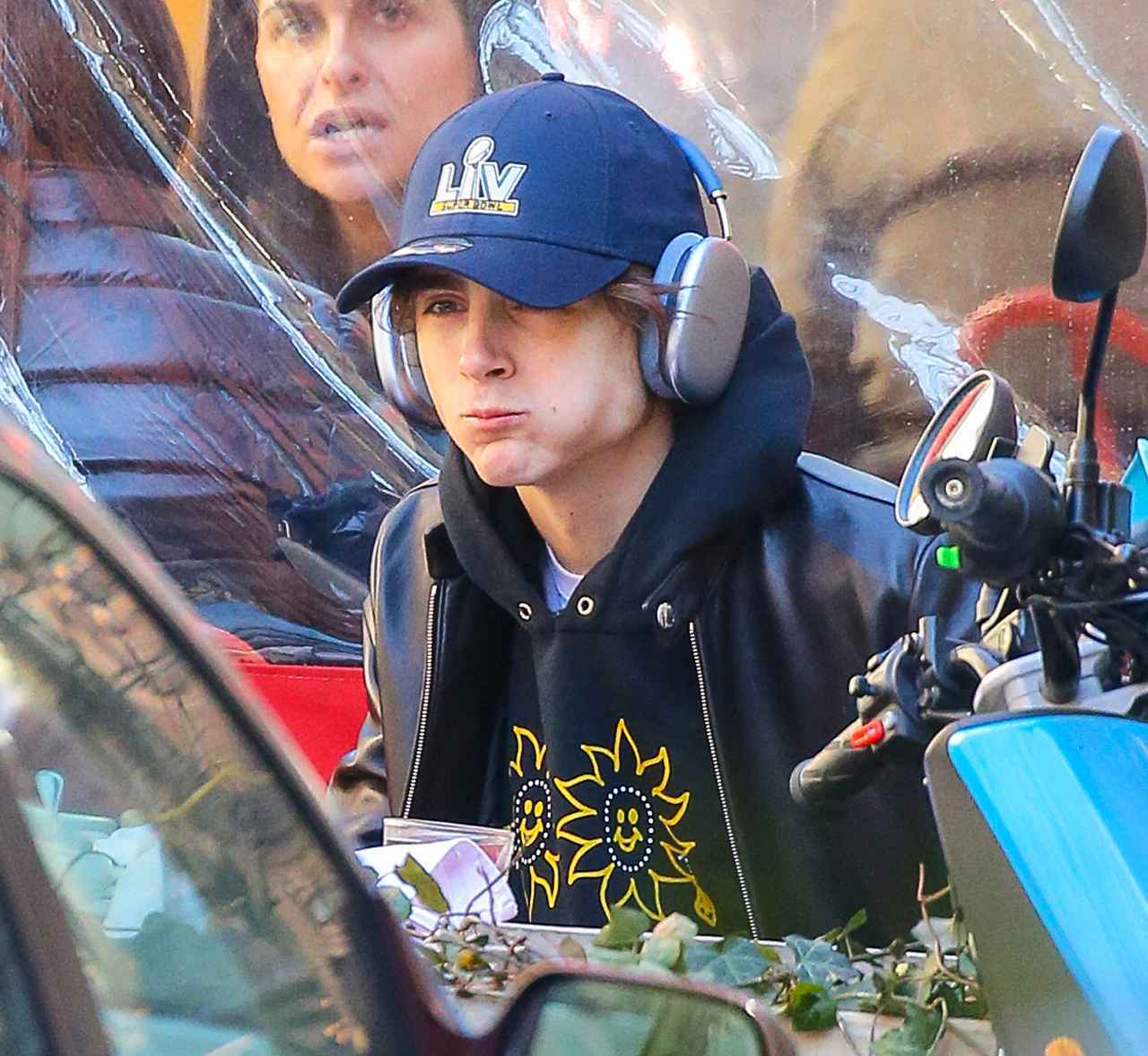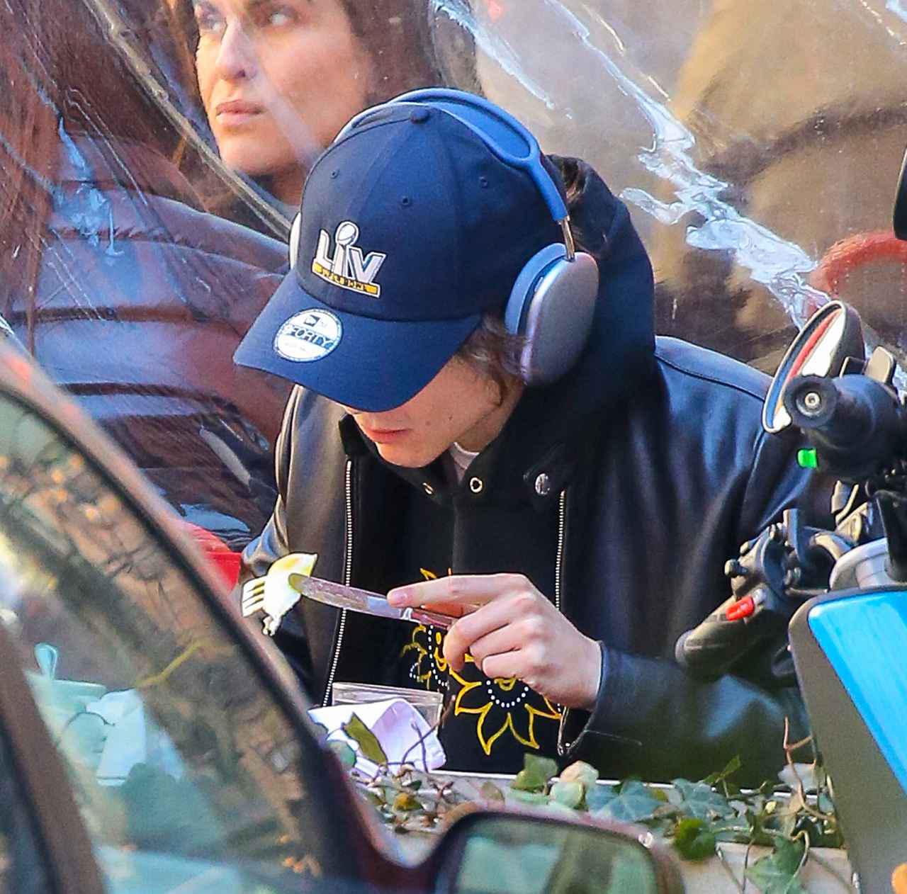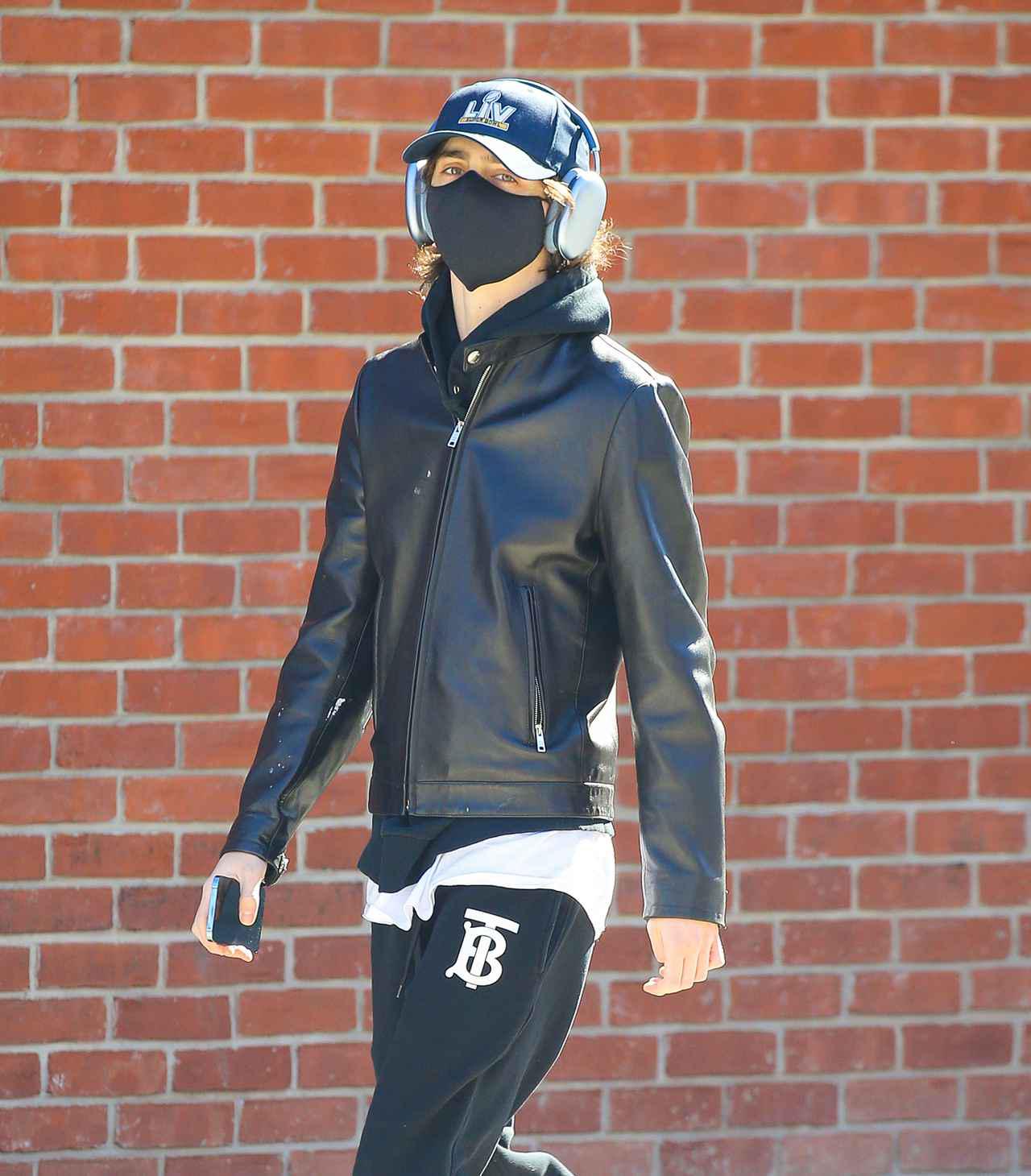 スウェットのズボンにパーカーと革ジャンを合わせ、キャップをしたうえでヘッドホンをつけるというリラックスした姿で現れたティモシー。最初はジャケットの前を閉めていたけれど、太陽の下で散歩をしているうちにポカポカとしてきたのか、その後はジャケットの前を開けていた。
