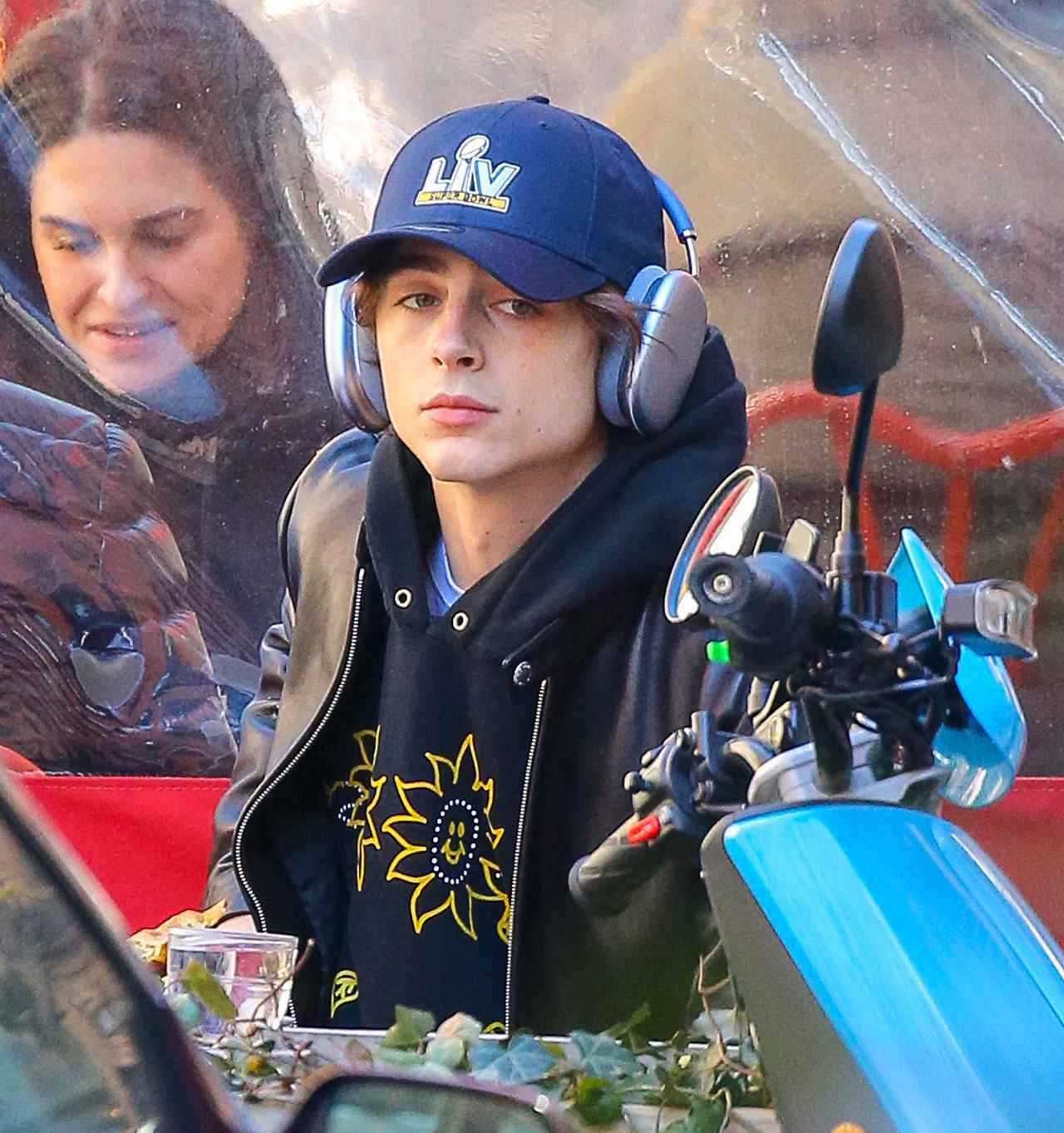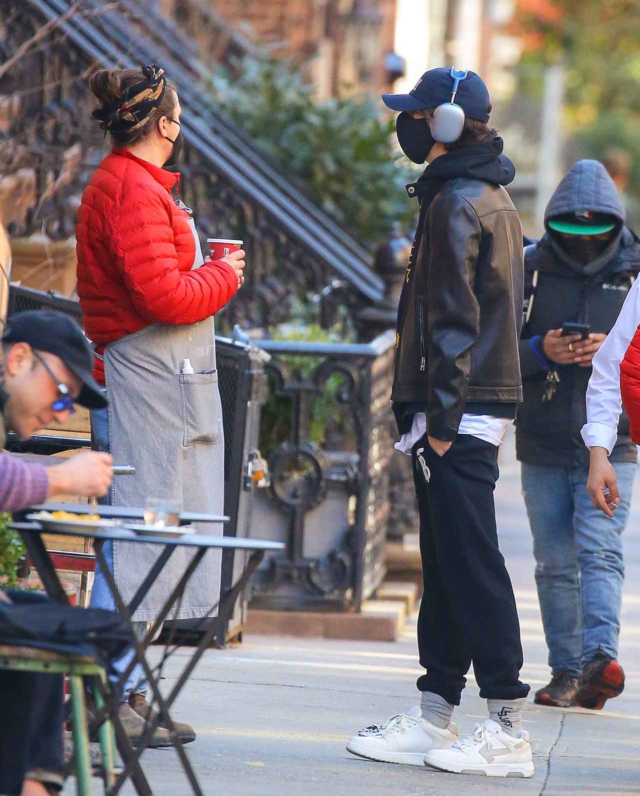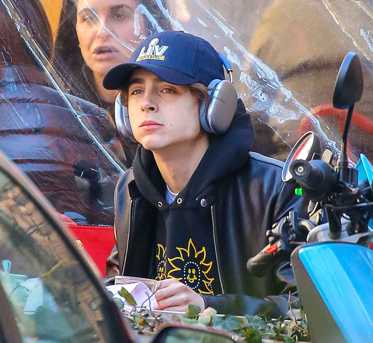 スウェットのズボンにパーカーと革ジャンを合わせ、キャップをしたうえでヘッドホンをつけるというリラックスした姿で現れたティモシー。最初はジャケットの前を閉めていたけれど、太陽の下で散歩をしているうちにポカポカとしてきたのか、その後はジャケットの前を開けていた。