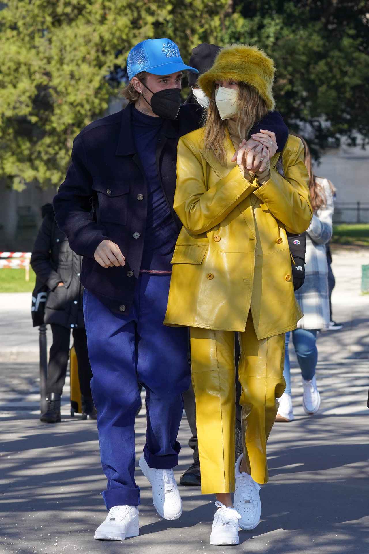 シンガーのジャスティン・ビーバーと妻でモデルのヘイリー・ビーバーが、足元をナイキのエアフォース1でそろえたカップルコーデでフランスのパリを歩いているところを激写。(フロントロウ編集部)