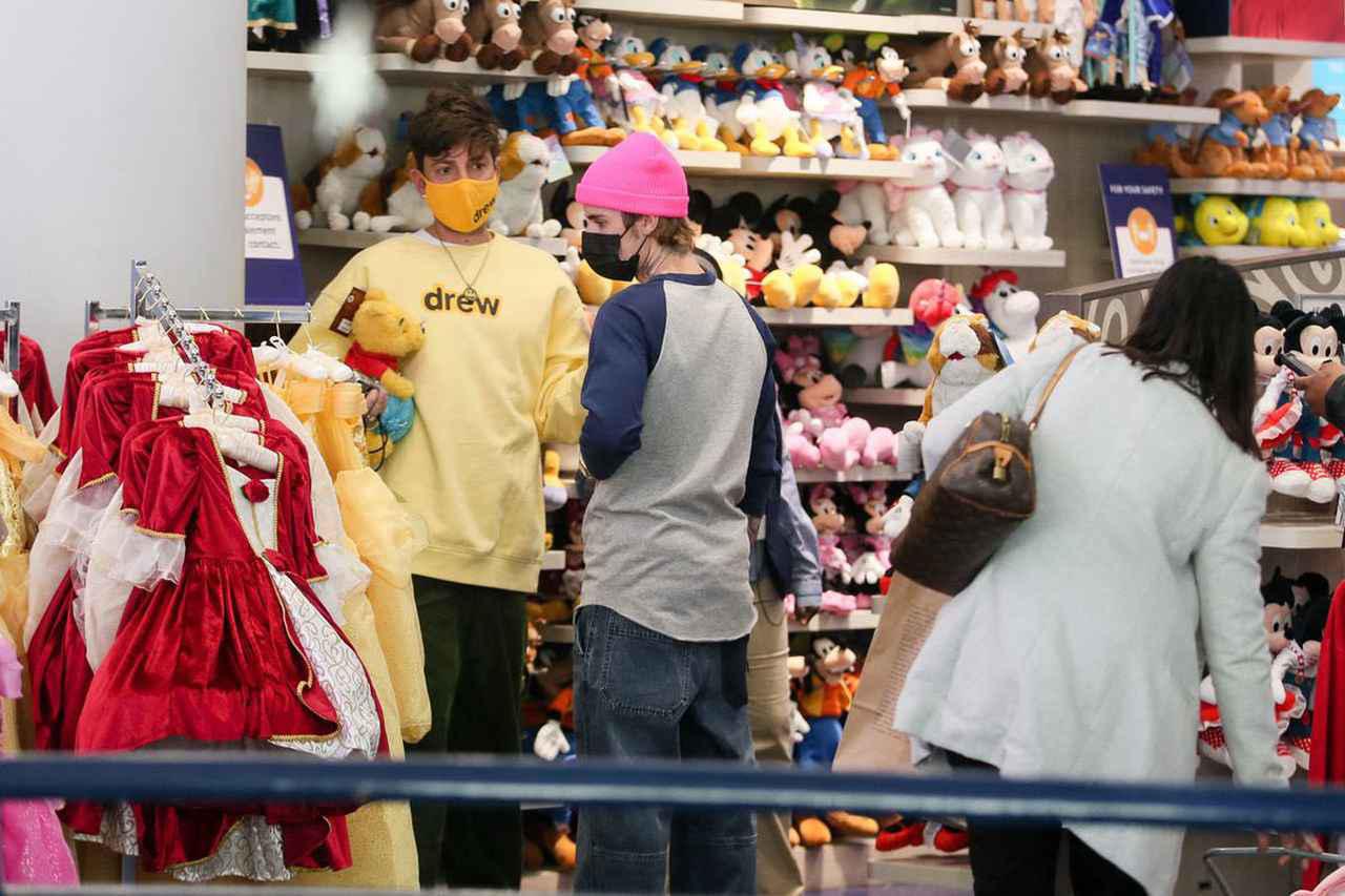 一般のお客さんに混じって店内を物色するジャスティンと、彼の友人でスタイリストのライアン・グッド。ジャスティンが選んだものだろうか? ライアンの手にはくまのプーさんのぬいぐるみらしきものが。また、そんなライアンの横に佇むジャスティンの視線は、『美女と野獣』のベルの子供用ドレスに向けられていた。