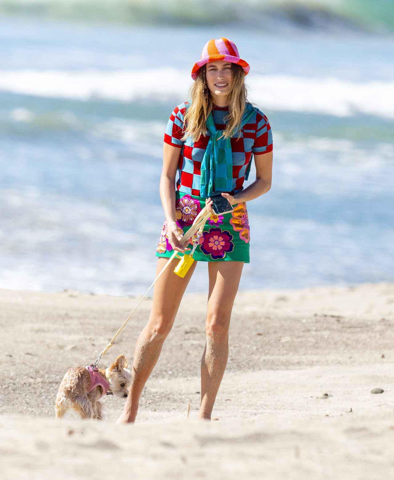 さすがはモデルだけあって、ただ犬の散歩をしているだけでも絵になる。美脚が際立つミニスカート姿でビーチでもかなり目立っていた。途中、パパラッチの存在を発見すると、カメラに向かってなにやらジェスチャーをする場面も。