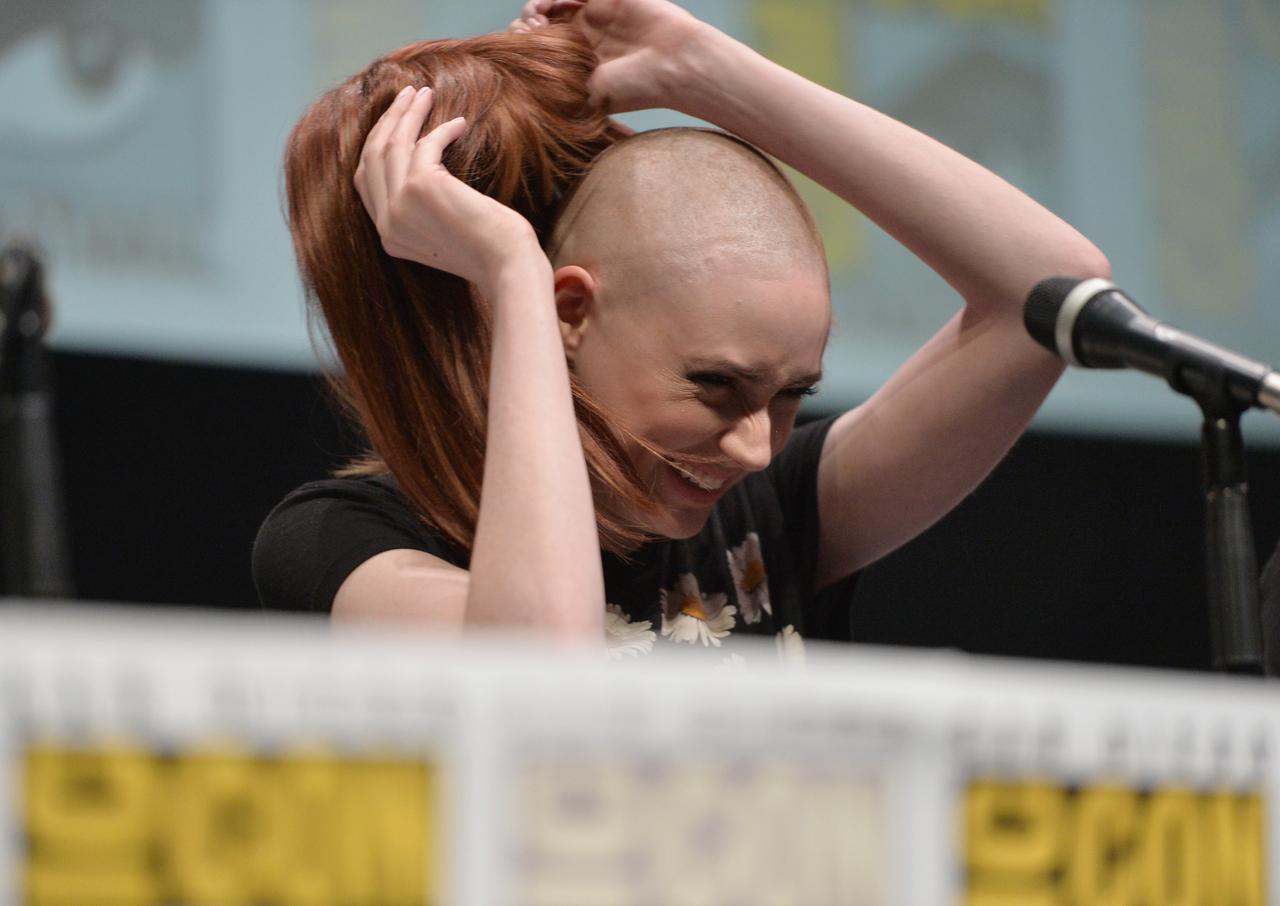 豊かで美しいジンジャーヘアが特徴のひとつだったカレンは『ガーディアンズ・オブ・ギャラクシー』でネビュラを演じるにあたり、髪の毛を全て剃り上げ、スキンヘッドにした。