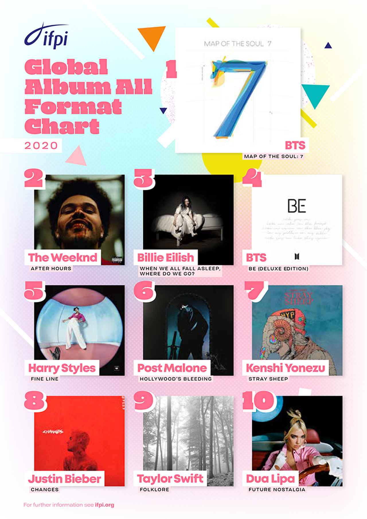 イギリスを拠点にする国際的な音楽業界の団体であるIFPI(国際レコード連盟)が2020年に世界で最も売り上げたアルバム10作品のランキングを発表。アメリカやUK、日本を含む世界各国のアルバムチャートで首位を獲得した、BTSが2020年2月にリリースしたアルバム『MAP OF THE SOUL : 7』がその1位に輝いた。