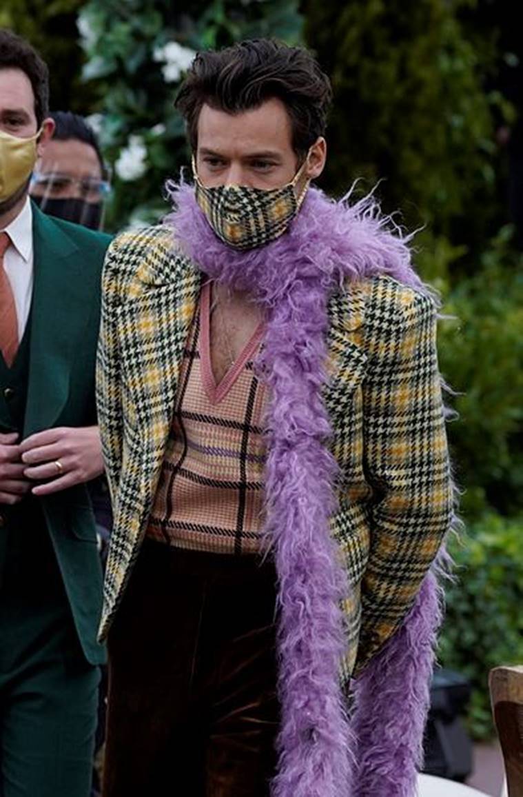 ハリーはジャケットと同素材のチェック柄マスクを着用してラグジュアリーに飾って。インナーにもピンクのチェック柄ニットを合わせた、ファッション上級者が好む「柄ON柄」コーデで注目を集めた。