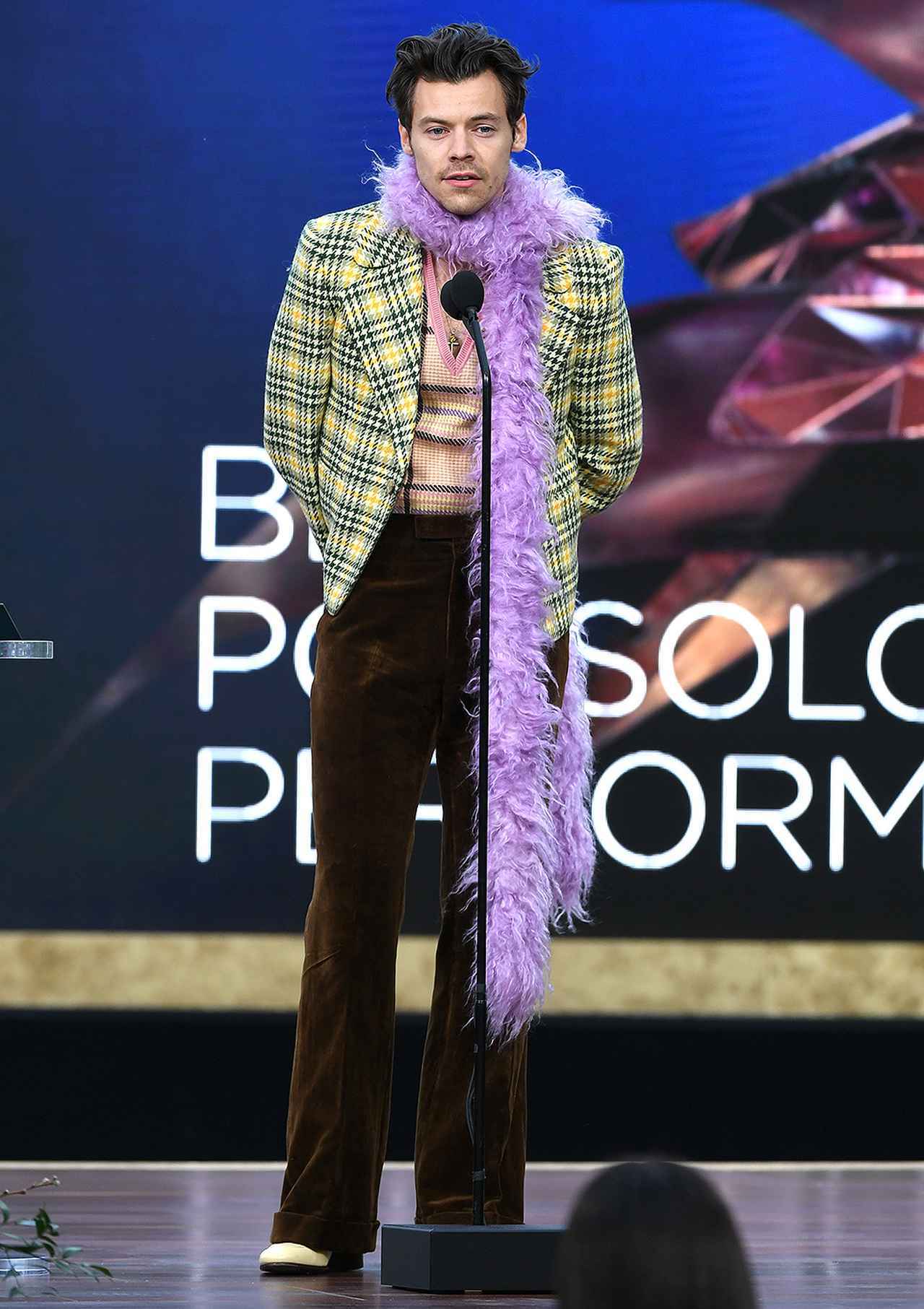 最優秀ポップ・ソロ・パフォーマンス賞を受賞した人気シンガーのハリー・スタイルズは、全身Gucci(グッチ)のアイテムでコーデ。ライトイエローのチェック柄のジャケットに、今年のトレンドカラーであるライラックのファーでポップなアクセントを置いたのがハリーらしい。