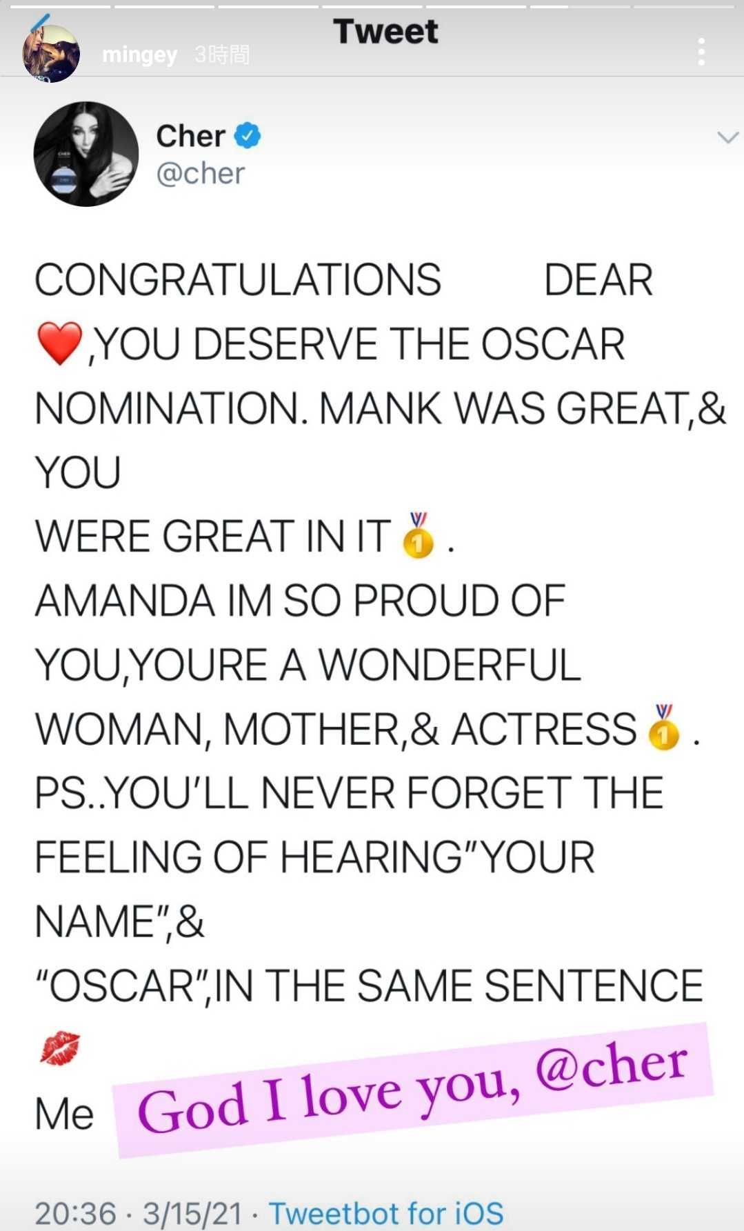 シェールは「おめでとう。愛する人。あなたはオスカーにノミネートされるにふさわしい。『Mank/マンク』は素晴らしかったし、あなたもとても素晴らしかった。アマンダ、あなたのことを誇りに思う。あなたは素晴らしい女性であり母親であり女優。追伸、「自分の名前」と「オスカー」を聞いた時の感情はずっと忘れないよ」とツイートして、アマンダの初ノミネートのお祝いと共に、感動的な瞬間は決して忘れることはないとメッセージを送った。