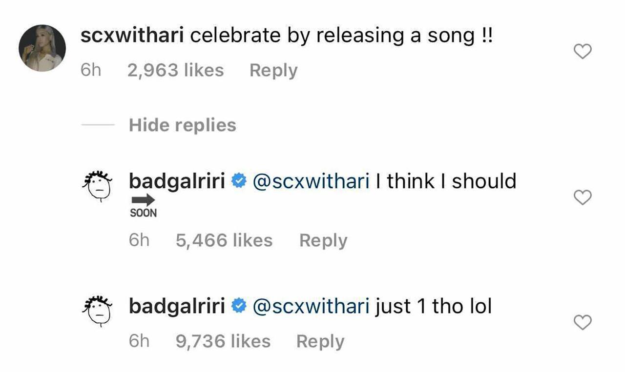 その投稿にはお祝いのメッセージが相次いだのだけれど、リアーナの新曲を待つファンの声も。そして数あるコメントの中で「曲をリリースしてお祝いしよう!」とのメッセージがリアーナの目に入ったよう。リアーナはアルバムや楽曲について聞かれるのはストレスがたまるのか、滅多に答えないけれど、今回は「もうすぐそうした方が良いと思う」「1曲だけだけどね(笑)」と、新曲がもうすぐリリースされるかもしれないことを明かした。