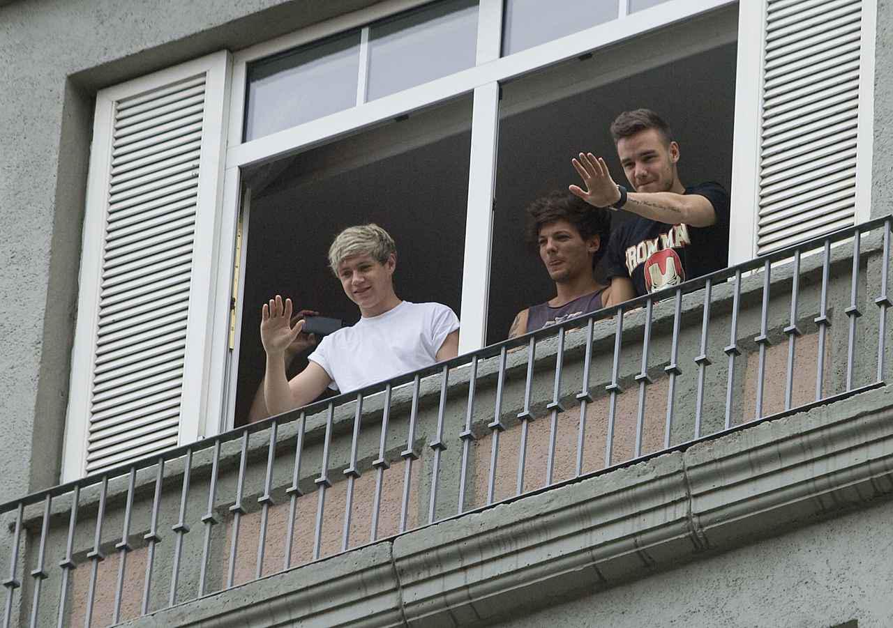 メキシコでホテルの部屋から出待ちするファンに向かって手を振るナイルとルイ、リアム。