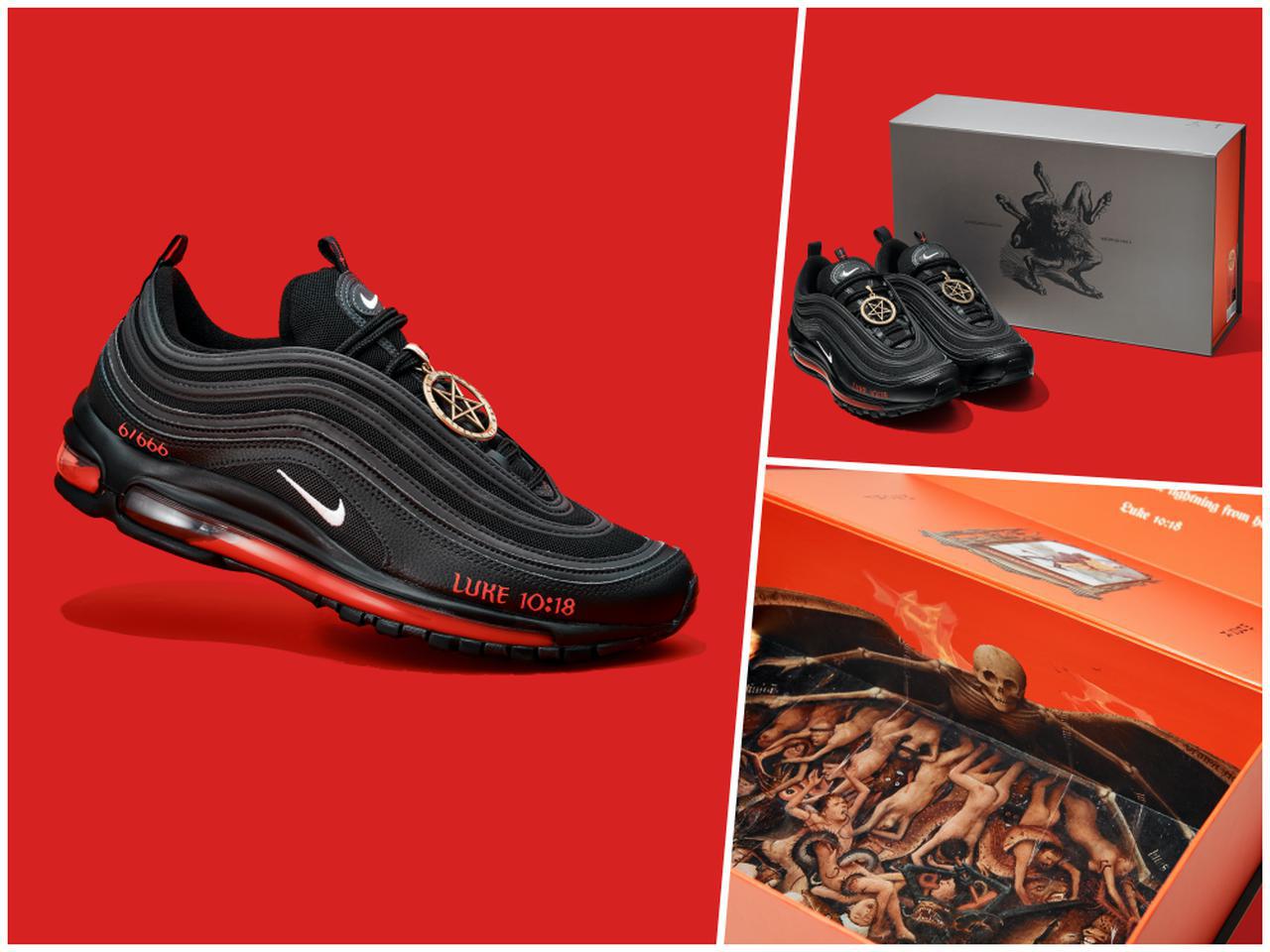 キリスト教の悪魔の名がつけられたサタンシューズは、ナイキ(Nike)が生み出した不動の名作スニーカー、エアマックス97ををカスタムしたもので、キリスト教において不吉な数字とされる666足限定で制作された。最大の特徴はソールのエアー部分に入った“赤い液体”で、米Wonderland Magazineによると、この謎の赤い液体にはMSCHFのスタッフによって提供された「人間の血」が1滴含まれているという。