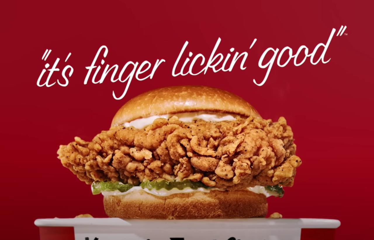 KFCの創業者であり広報担当のカーネル・サンダースに扮した俳優が、新商品のケンタッキーフライドチキンサンドイッチ(Kentucky Fried Chicken Sandwich)を紹介する約15秒のCMのラスト1秒にご注目。ほんの一瞬ではあるものの、「It’s Finger Licking’ Good」の文字が。