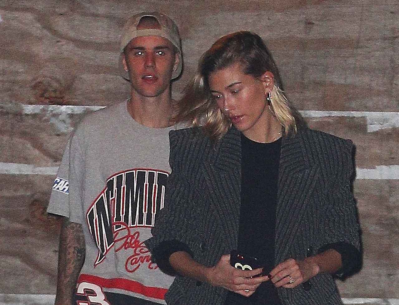 教会の集まりを終えて建物から出てくるジャスティン・ビーバーとヘイリー・ビーバー。