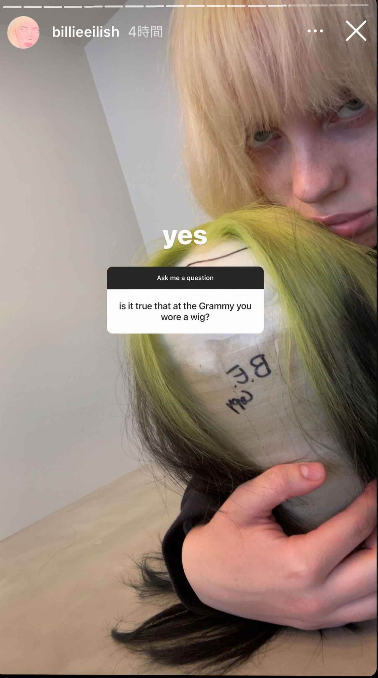 先日、ビリーはインスタグラムで珍しく、ファンの質問に答えるQ&Aを実施。先日、プラチナムブロンドヘアにイメチェンした姿をお披露目したビリーは、“日本時間3月15日に開催されたグラミー賞の授賞式には、黒×ネオングリーンのウィッグを被って出席したというのは本当ですか?”という質問に、ウィッグと撮影した写真を投稿して回答するなど、ファンから寄せられた様々な質問に答えた。