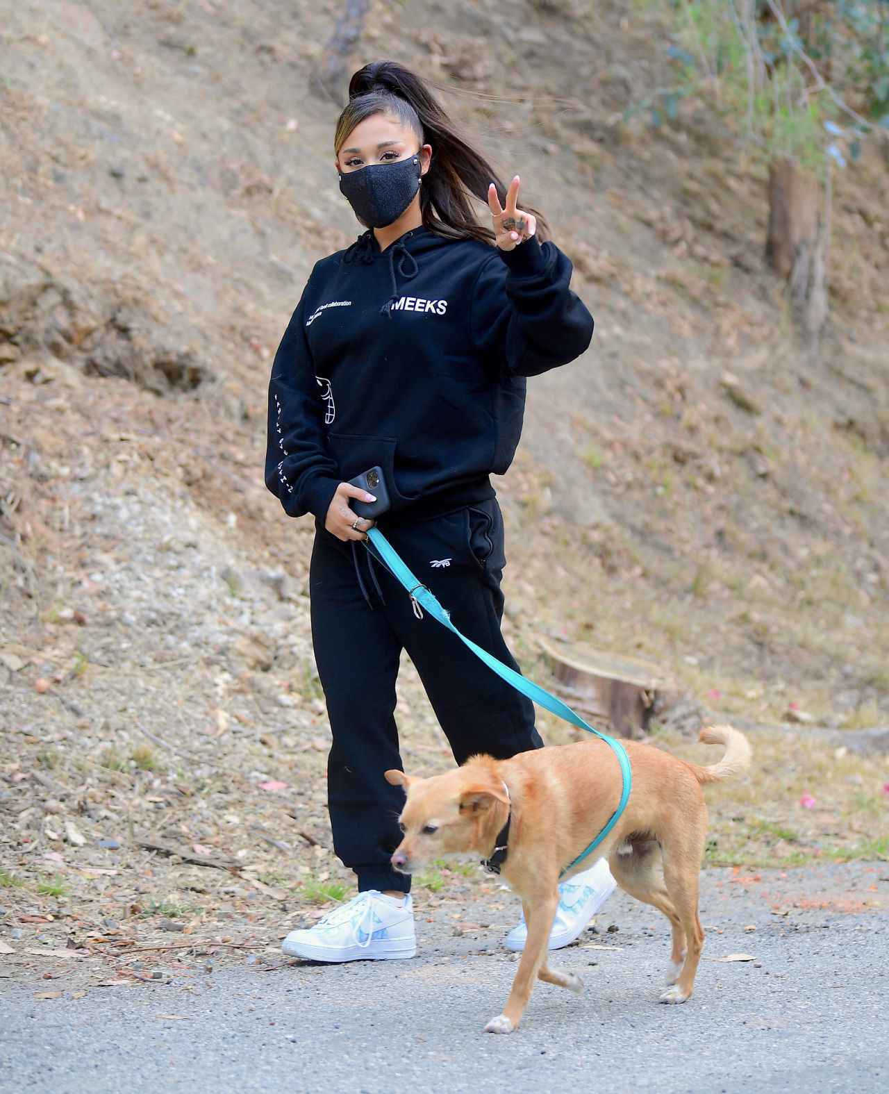 愛犬と散歩中のアリアナ・グランデは、MEEKS GANGのフーディにReebok x Victoria Beckham (リーボック x ヴィクトリア・ベッカム)のスウェットパンツをセットして、別ブランドのアイテムを同色で揃えてセットアップ風にコーデ! マスクもブラックで統一して見せて。