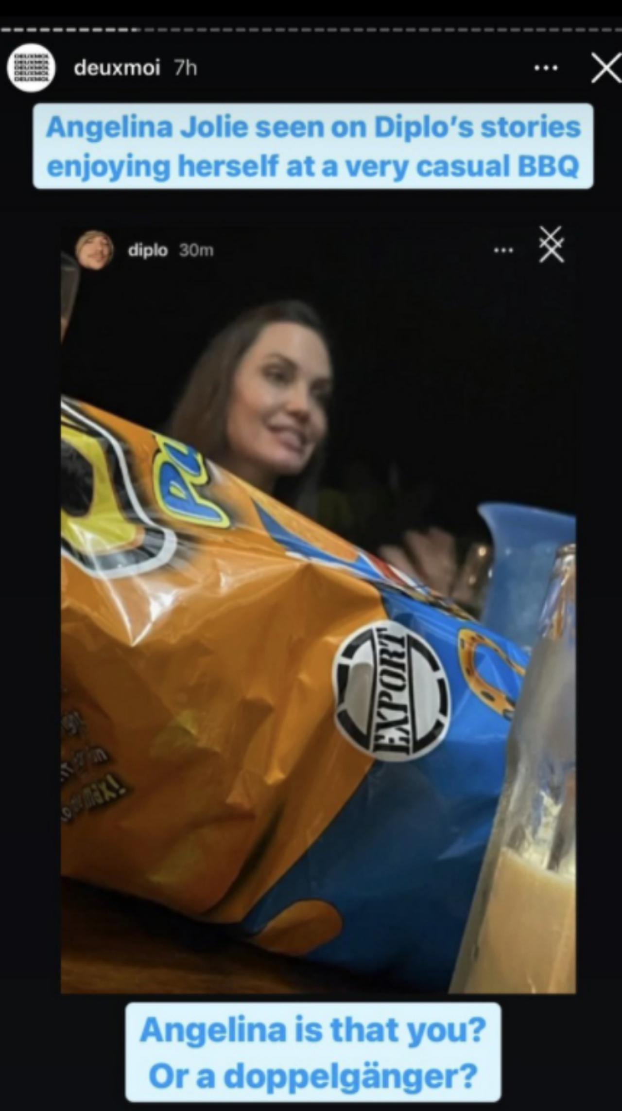 セレブの目撃談やエンタメ業界の内部情報を扱うアカウントdeuxmoiに寄せられた証言によると、バーベキューには、アンジェリーナの子供の1人が何らかのレッスンを受けている知人男性も参加していたといい、アンジェリーナはこの人物と一緒にディプロのバーベキューに参加したのではないかと見られている。