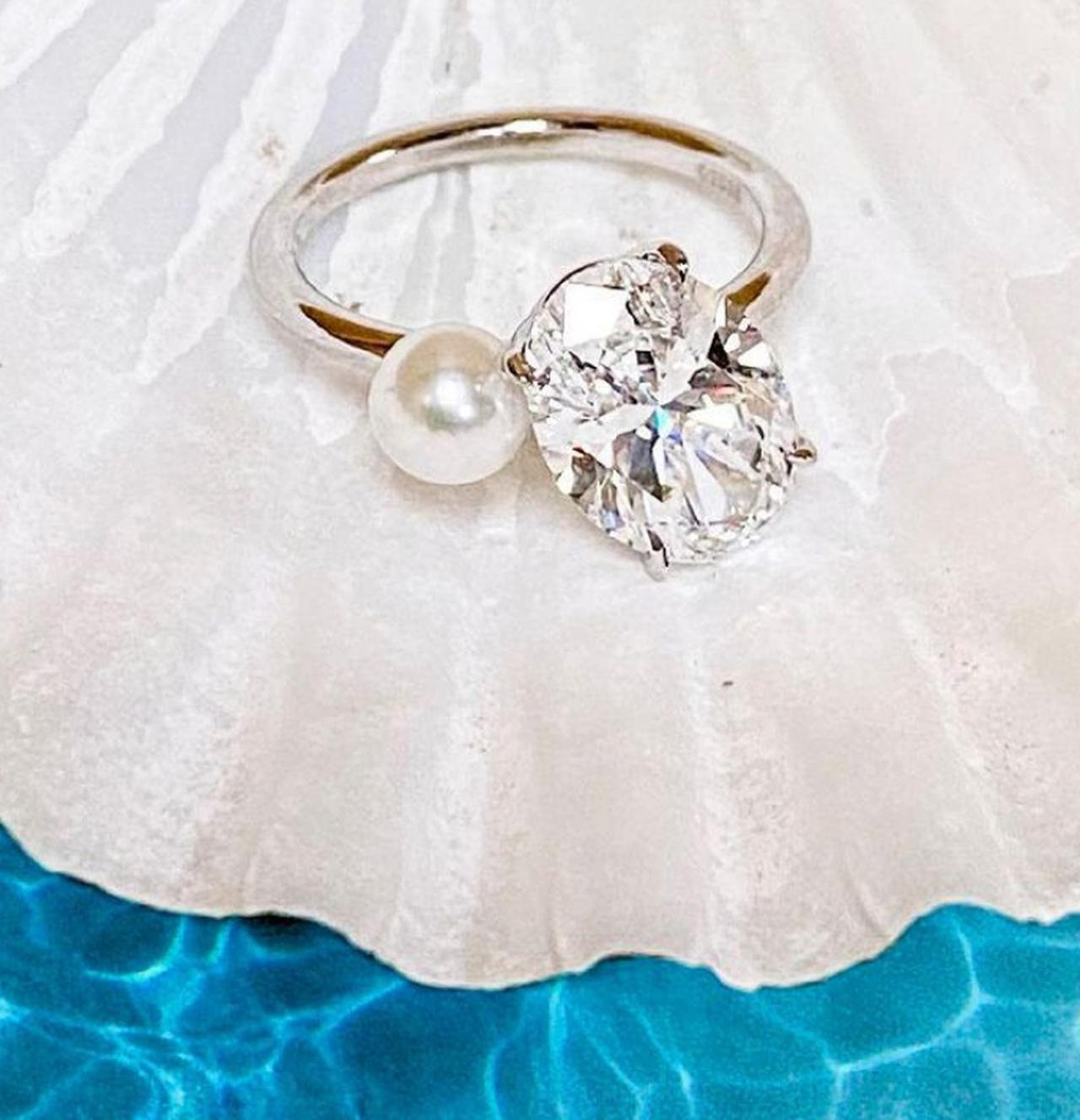 ダルトンとの仲睦まじいツーショットに「forever n then some(永遠、そしてそれ以上)」というシンプルでおしゃれなひと言を添えてファンたちに婚約を報告したアリアナの薬指には、少し傾いて配置されたオーバル型のダイヤモンドを小粒のパールが支えているようにも見える、めずらしいデザインの婚約指輪が光っていた。