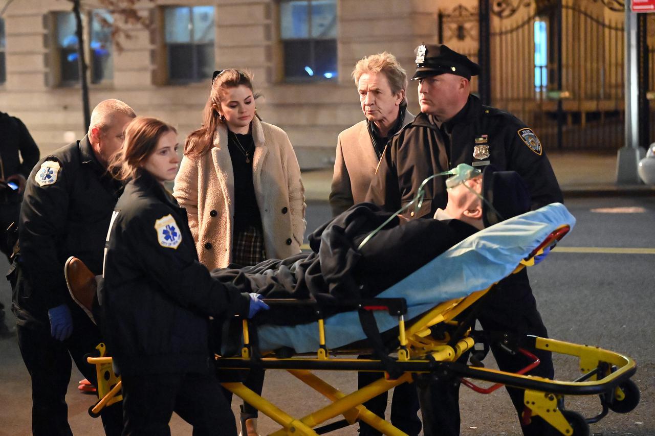 今年3月、ニューヨーク市内で『Only Murders In The Building』の撮影を行なっているところを目撃されたセレーナ・ゴメス、マーティン・ショート(セレーナの右隣)、スティーヴ・マーティン(救急搬送用のストレッチャーの上)の3人。